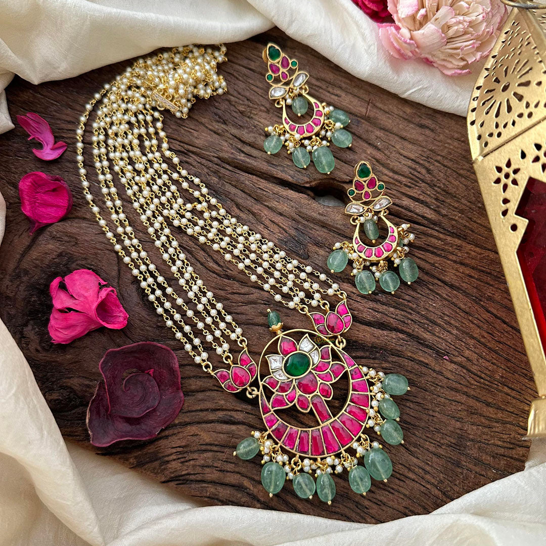 Elevate your style with our Exquisite Jadau Kundan Lotus Pendant Haram, finished with a delicate pearl and matching earrings. This timeless piece exudes elegance and sophistication, perfect for any occasion. Adorn yourself with luxury and grace.
