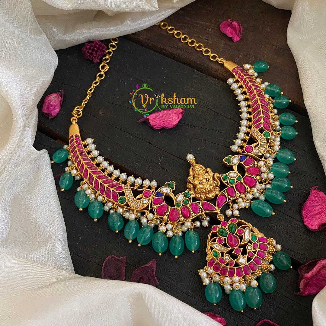 Exquisite Jadau Kundan Neckpiece with lakshmi on Pendant kundan & precious stone studded premium quality green bead finish neckpiece.