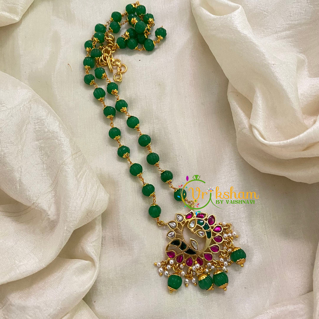 Pearl and semi precious bead mala with Jadau work RED GREEN and WHITE kundan pendant. Comes with a back rope. Midlength or long neckpiece.