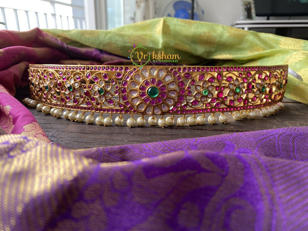 Exquisite Kundan and Kemp Hip Belt - Green and Pinkish red kemp stones and White kundan stones; pearl finish bottom and adjustable back belt.
