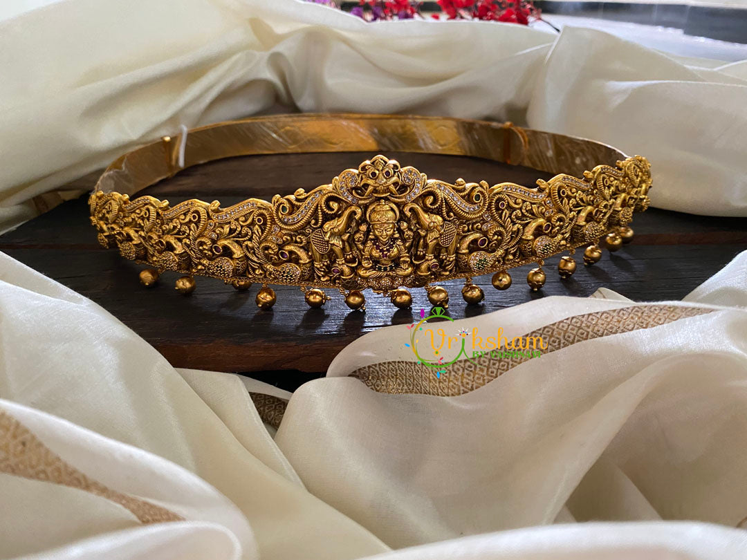 Exquisite Lakshmi Hipbelt with Elephants – A center lakshmi idol piece with white red and green stones on elephants sides and peacock across.