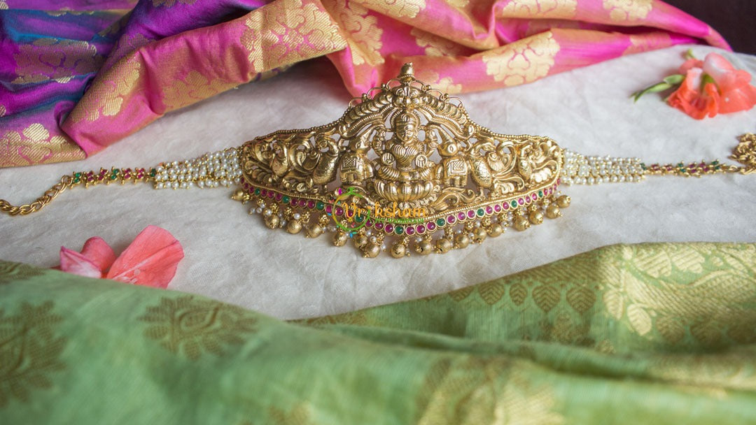 Exquisite Lakshmi Pendant Hipchain - Lakshmi idol with peacocks and cluster pearl ad stone set hipchain.