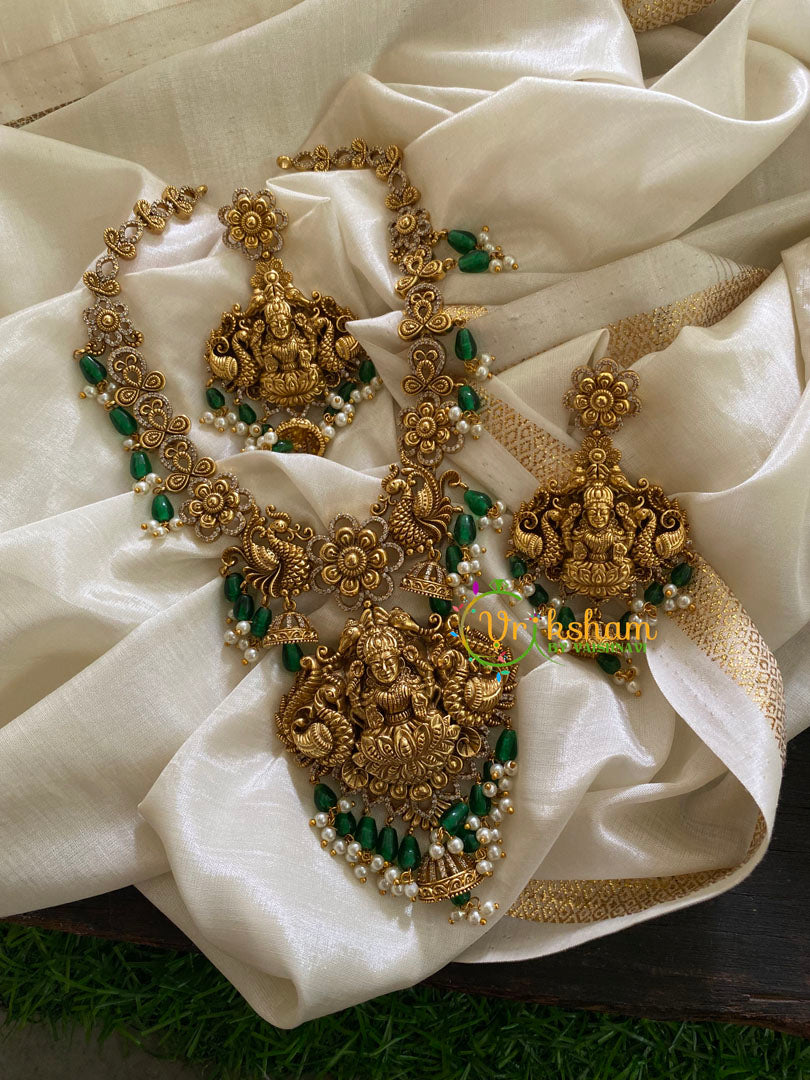Exquisite Lakshmi Temple Haram Long Neckpiece -Intricately Designed Temple Choker with Lakshmi idol, peacocks and flowers, comes with matching ear hangings. Green bead Finish.