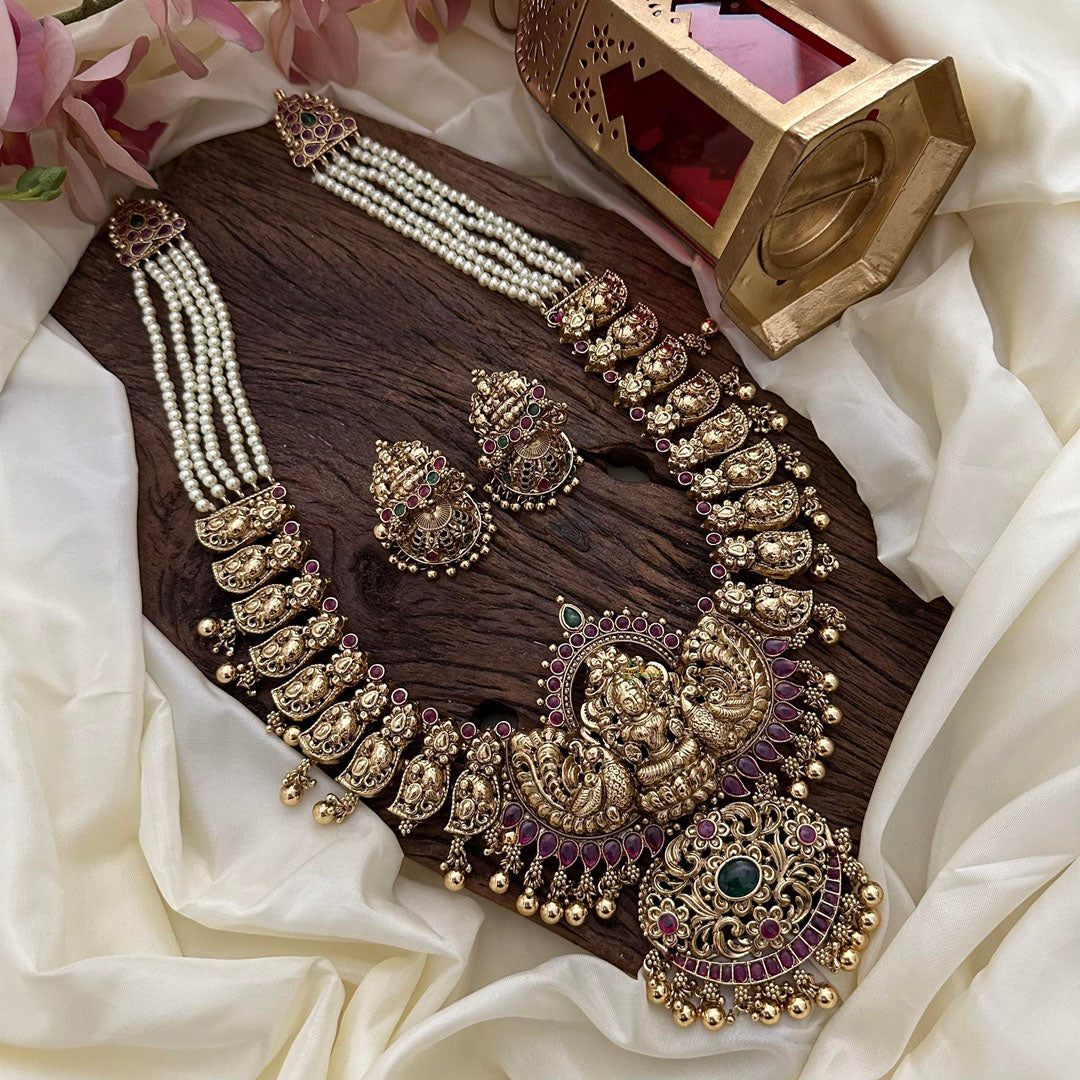 Introducing our Exquisite Layered Mayil Lakshmi Long Neckpiece, adorned with shimmering gold beads and lustrous pearls. This luxurious piece exudes elegance and sophistication, perfect for adding a touch of glamour to any outfit. Elevate your style with this exclusive neckpiece inspired by the beauty and grace of the Mayil Lakshmi figure.