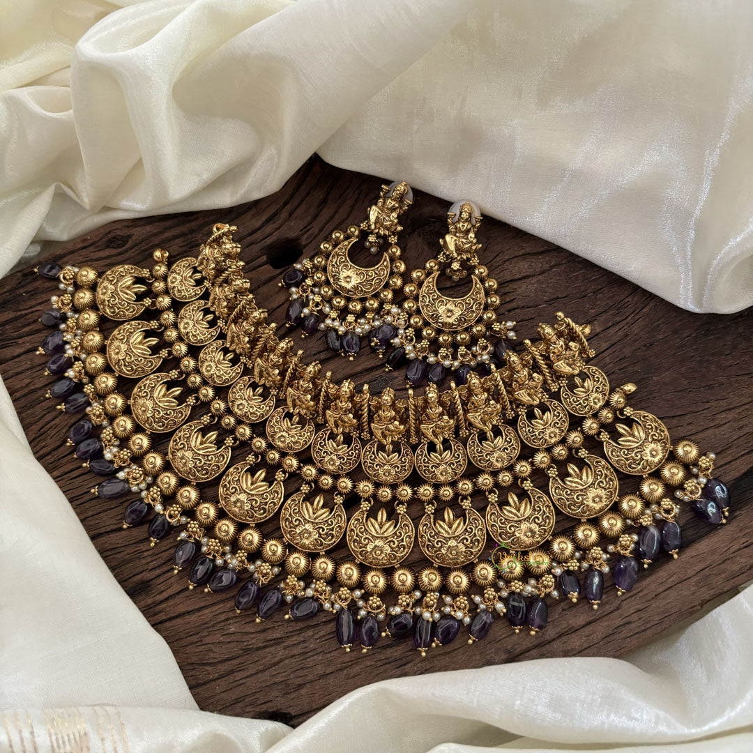 Exquisite Layered Royal Lakshmi High Neck Choker -a complete multiple Lakshmi neckpice arranged in linear and layer fashion intricate one of a kind unique temple choker. Comes with matching danglers; PURPLE BEAD FINISH.