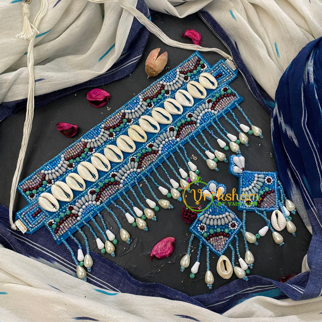 Fabric Statement Choker Neckpiece -Blue beads and shell woven fabric high neck choker with white thread extension. Pearl and Bead Finish.
