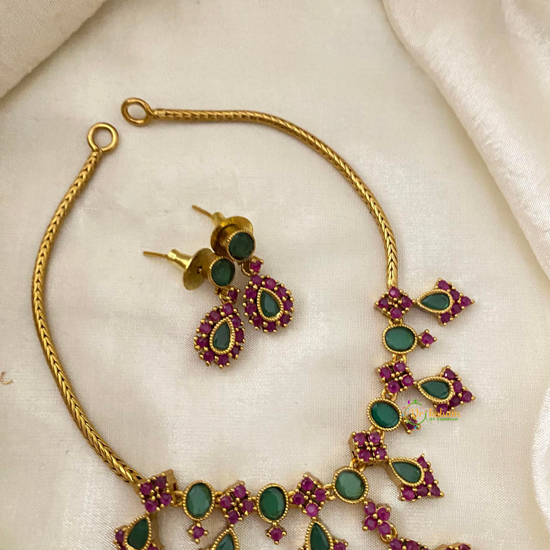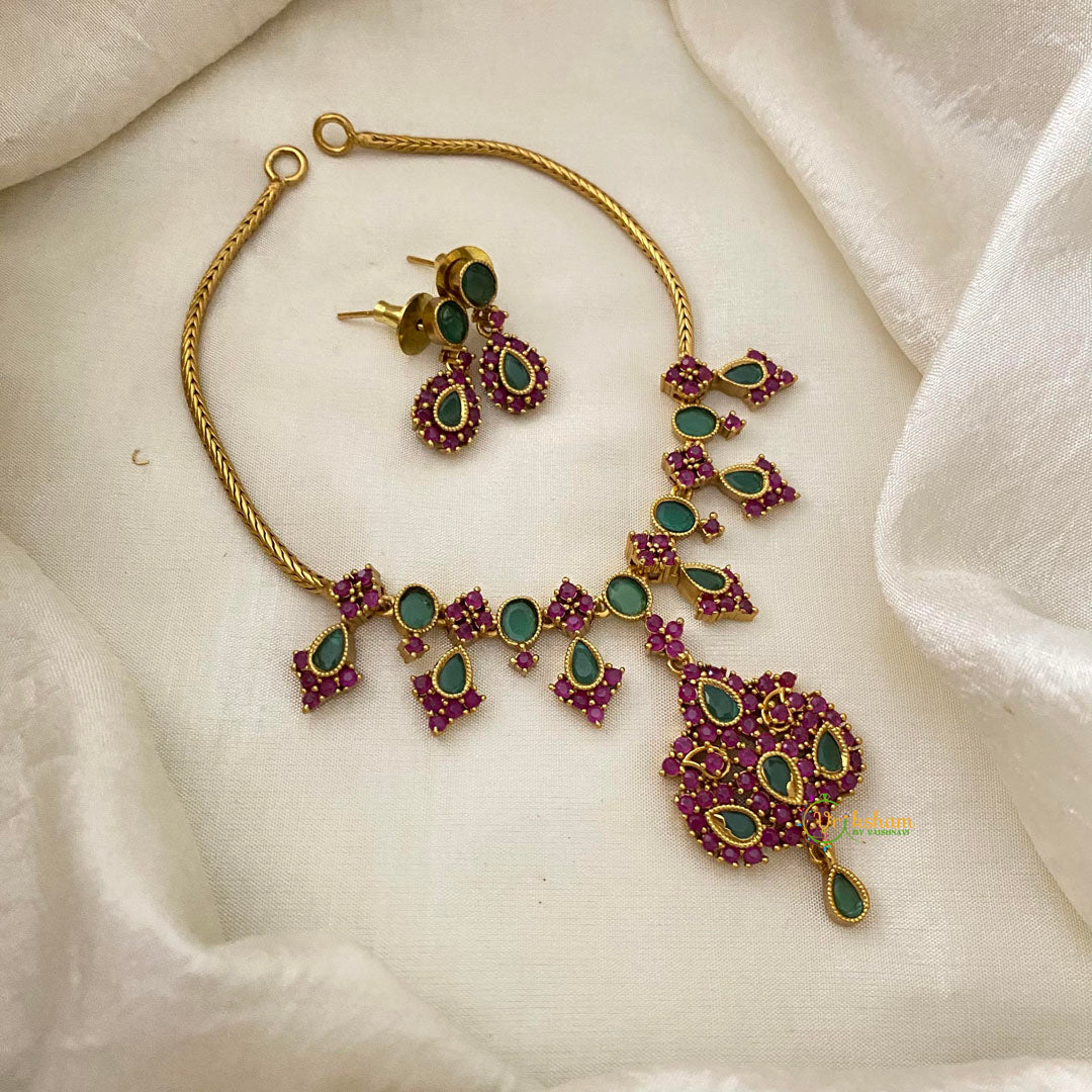 Fancy AD Stone Bala ji Addigai Choker-Red Green- Premium quality re green AD Stone studded pendant addigai. Addigai short neckpiece, comes with matching earrings.