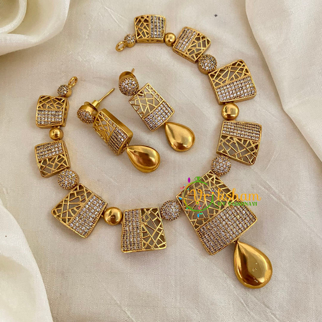 Fancy AD Stone Designer Neckpiece - White gold look alike white stone set designer neckpiece, comes with matching studs.