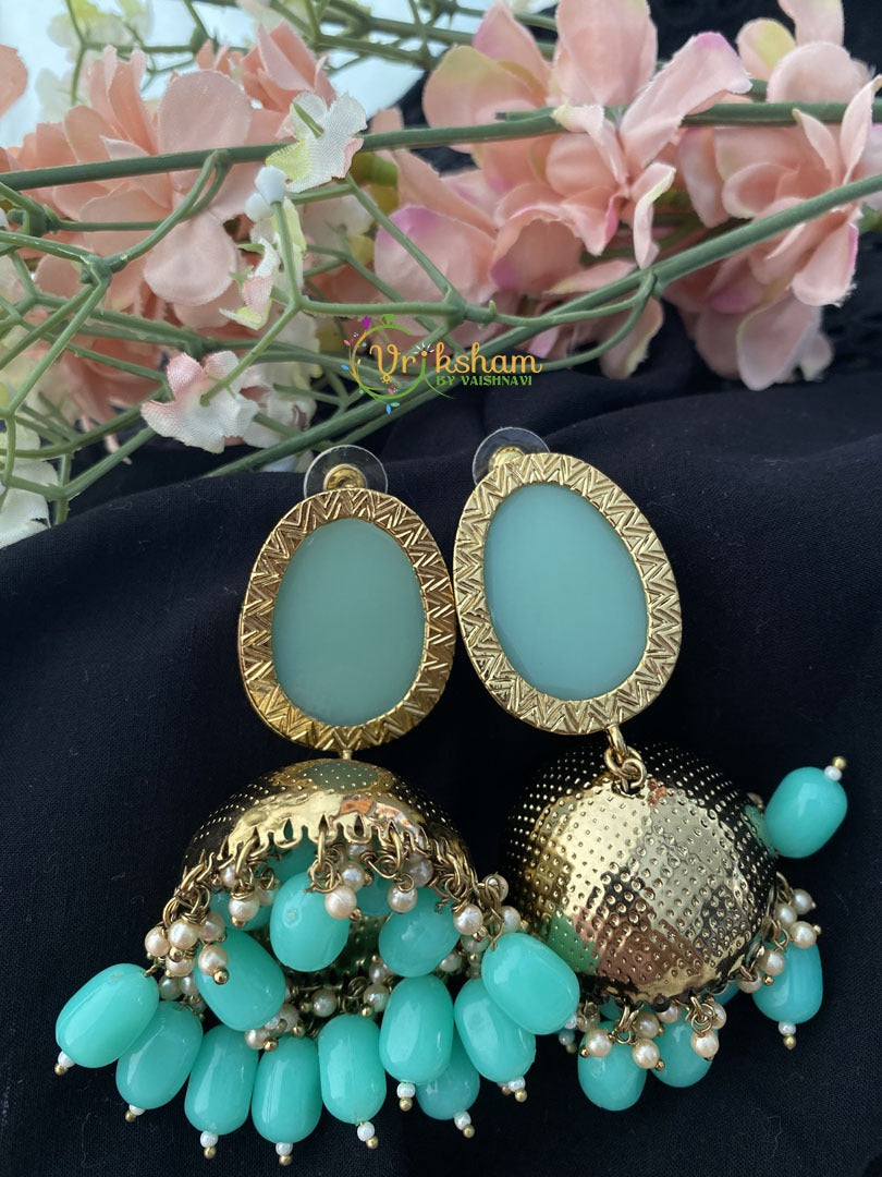 Fancy Designer Jhumkas -Sea Blue -Triangle Pattern -on borders of the studs with pearl and bead finish.
