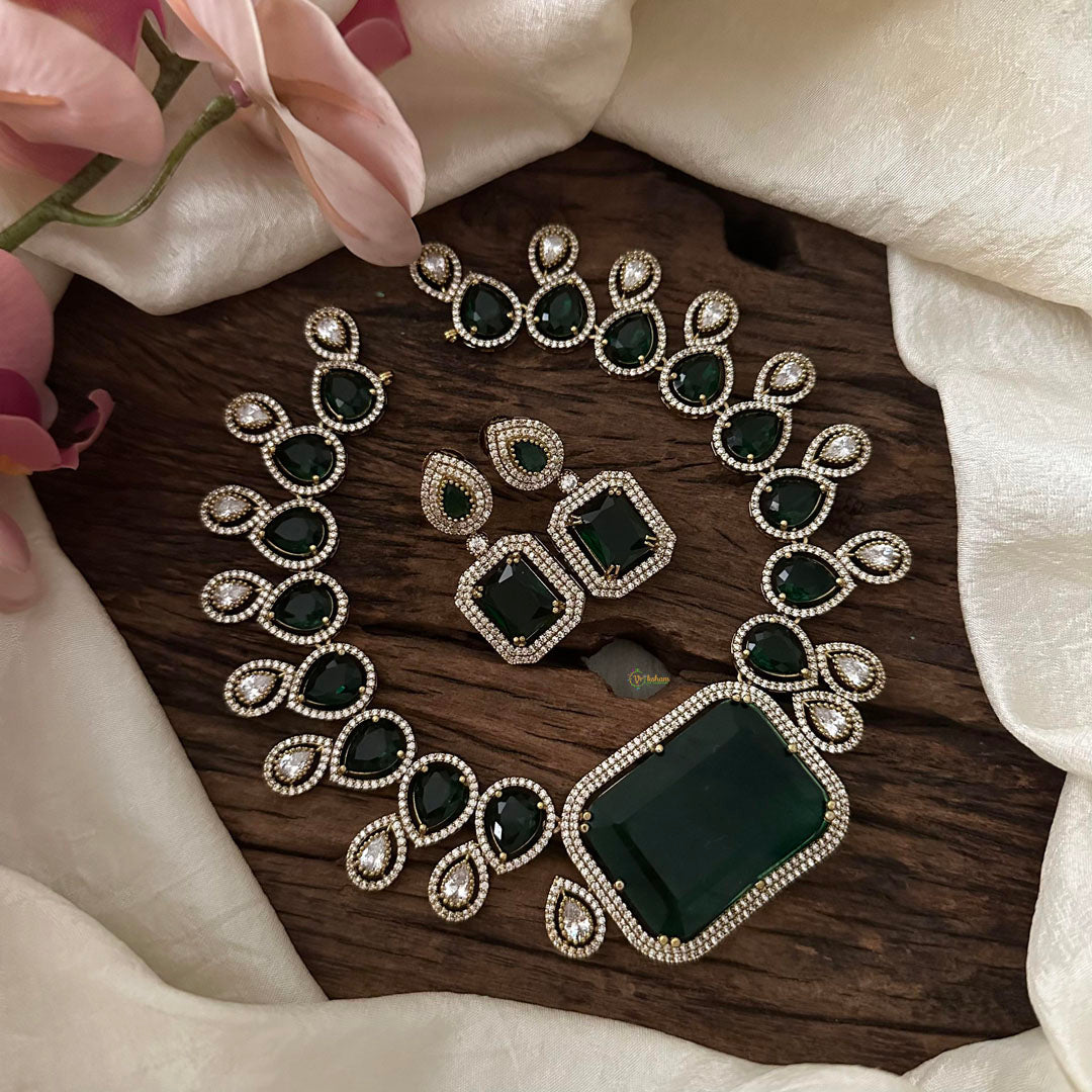 Indulge in luxury with our Fancy Emerald Green Victorian Diamond Neckpiece. This exquisite drop-shaped neckpiece features a stunning pendant in a classic rectangle shape, adorned with shimmering diamonds. Complete the look with the matching earrings for a truly elegant and sophisticated style. Elevate your wardrobe with this exclusive piece.