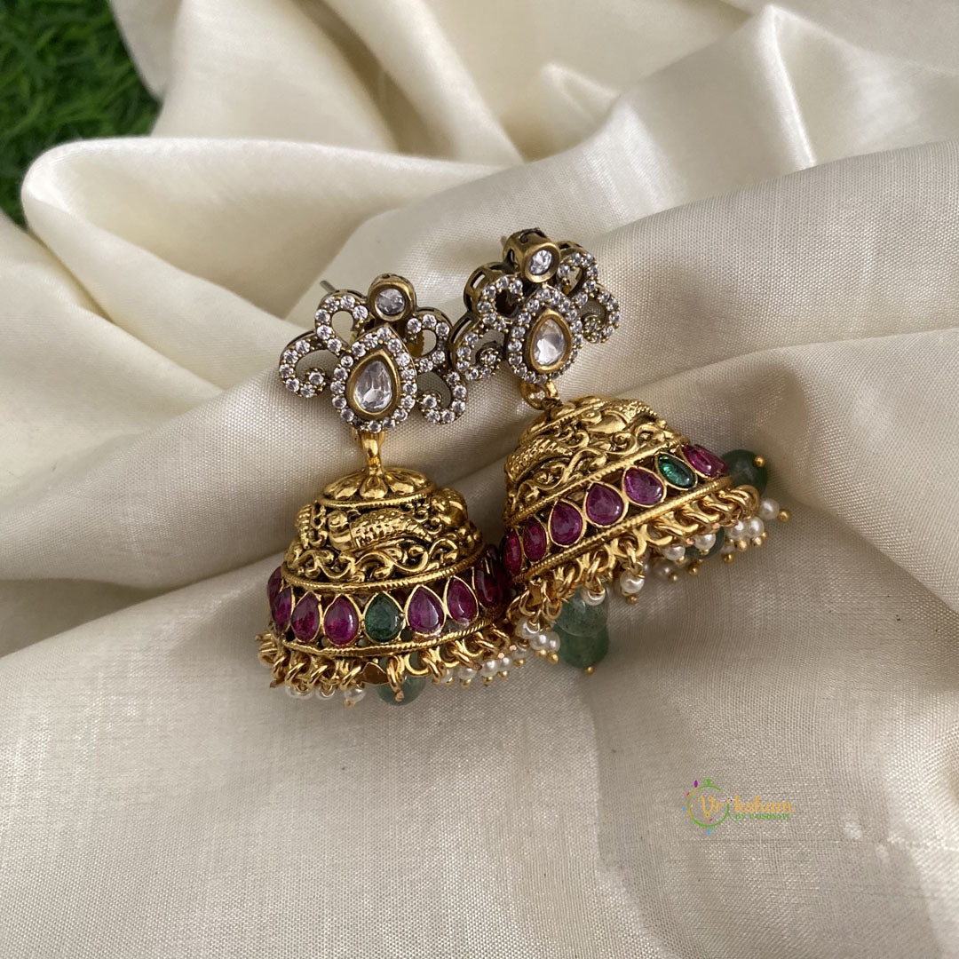Fancy Gold Alike Victorian Jhumkas-White Pearls-Green Beads - The Fancy Gold Alike Victorian Jhumkas and white pearls and green beads embody elegance and tradition in every detail. Perfect for both formal occasions and everyday wear, these jhumkas evoke the grandeur of Victorian era temples, making them a statement piece for those who appreciate refined classic beauty.