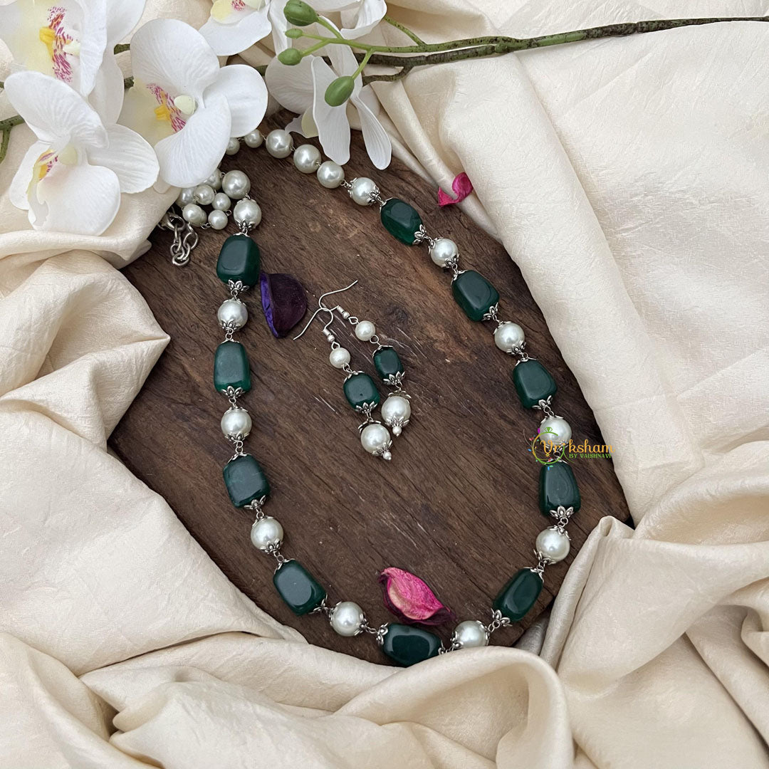 Indulge in luxury with our Fancy Green Stone Pearl Maala Neckpiece. Adorned with green stones and pearls, this neckpiece exudes sophistication and elegance. Comes with matching earrings for a complete and glamorous look. Perfect for weddings and special occasions. Elevate your style with this exclusive piece.