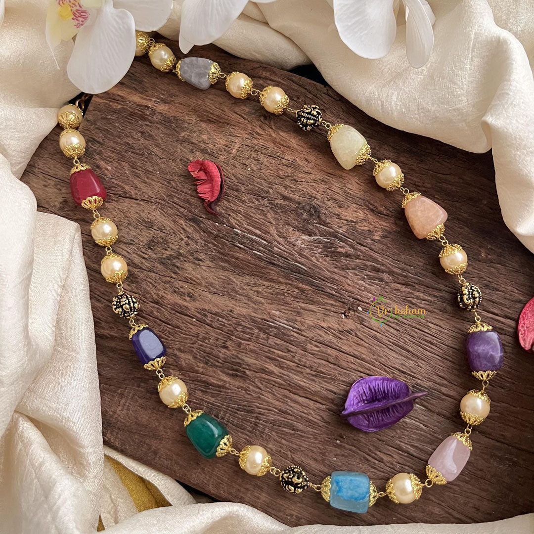 Elevate your style with our Fancy Navrathna Stone Golden Pearl Maala Neckpiece. The brilliant navrathna stones and delicate golden pearls exude luxury and sophistication, making it the perfect accessory for any occasion. Enhance your look and make a statement with this unique and elegant piece.