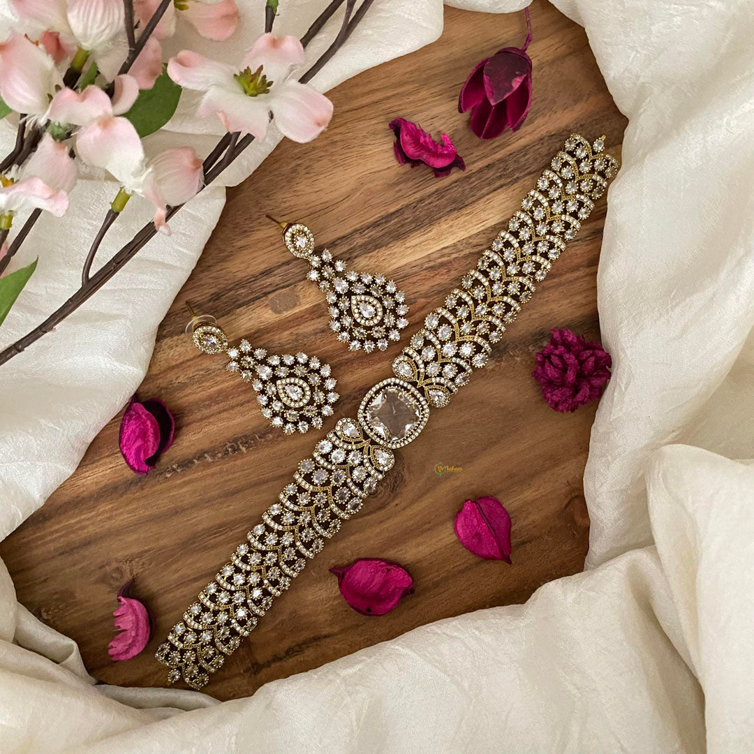 Elevate your fashion game with our Fancy Victorian Diamond Choker. This stunning piece boasts intricate detailing and sparkling diamonds that will elevate any outfit. Add a touch of elegance and luxury to your style with this beautiful white choker. Comes with matching earrings.