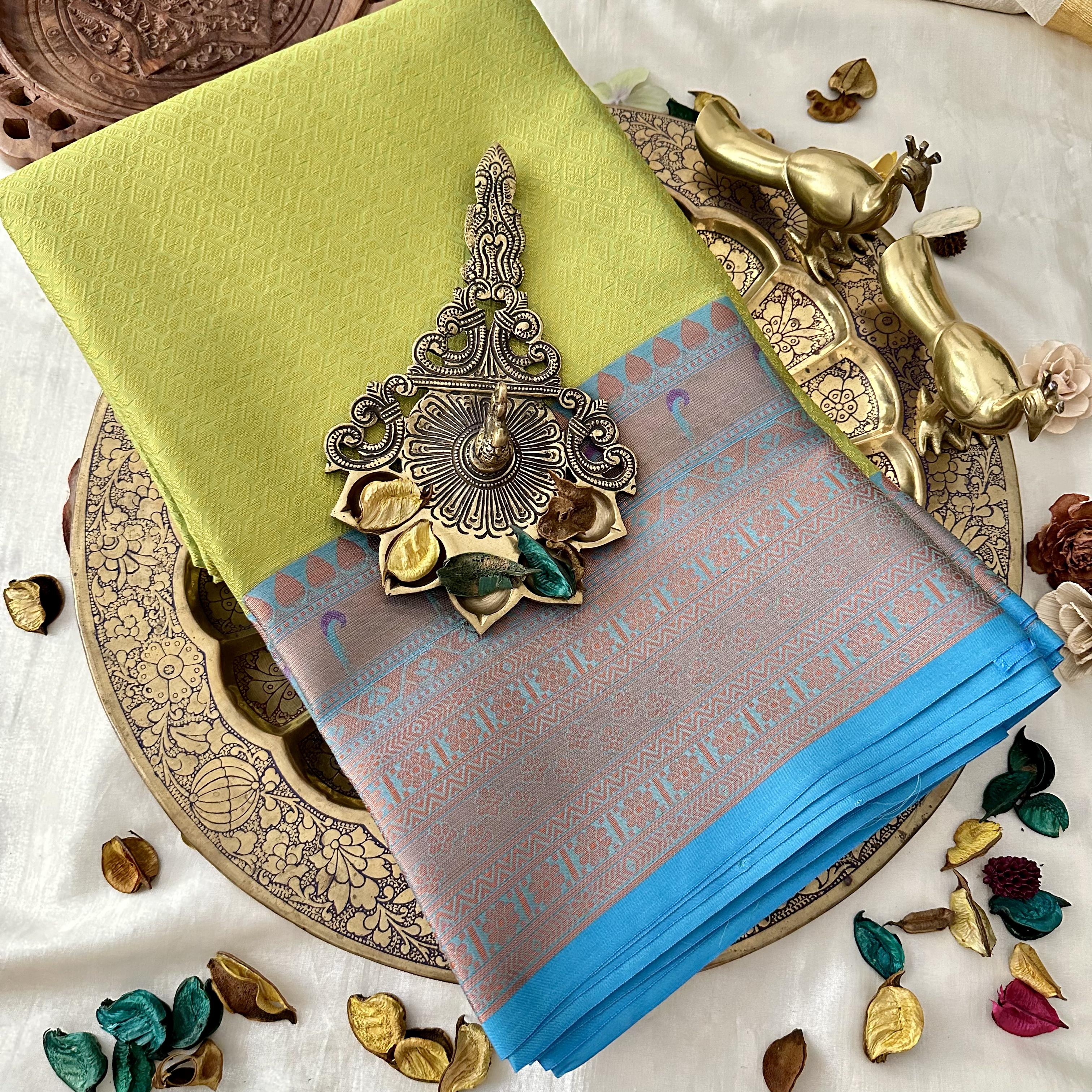 Parrot Green Color Kora Muslin Saree with Blue Border – Festive wear Kora Muslin saree manufactured in Varanasi –designer printed throughout the saree ; comes with Blouse attached.