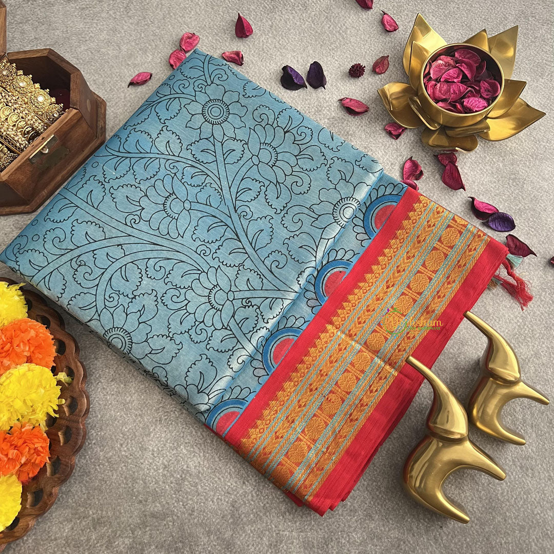 Experience luxury and sophistication with our Firosa Color Silk Cotton Kalamkari Saree. Handloom crafted with a red border and intricate golden zari work, this saree exudes elegance and exclusivity. Elevate your style and make a statement with this masterpiece.