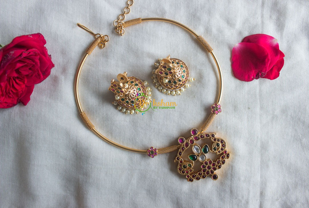 Floral Annam Pendant Hasli Choker -AD Stone studded premium quality pendant hasli neckpiece, comes with matching jhumkas.