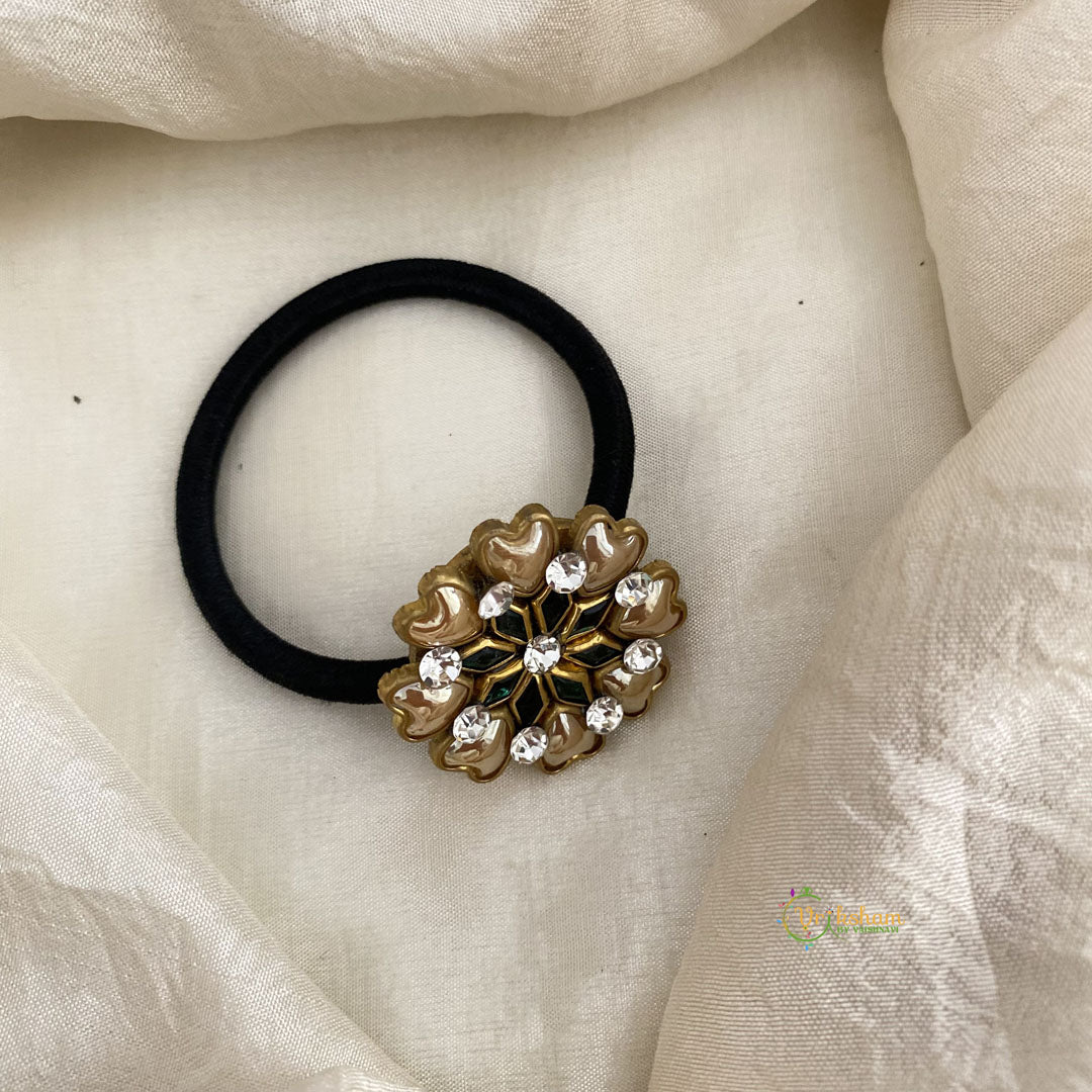 Floral Golden, Green Kundan Pendant Rubber Band - Heart Shape -Festive Wear Hair bands-premium gold like polish pendant.