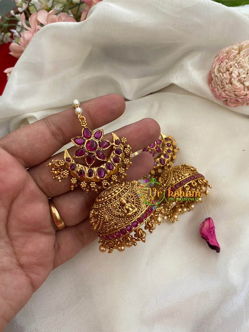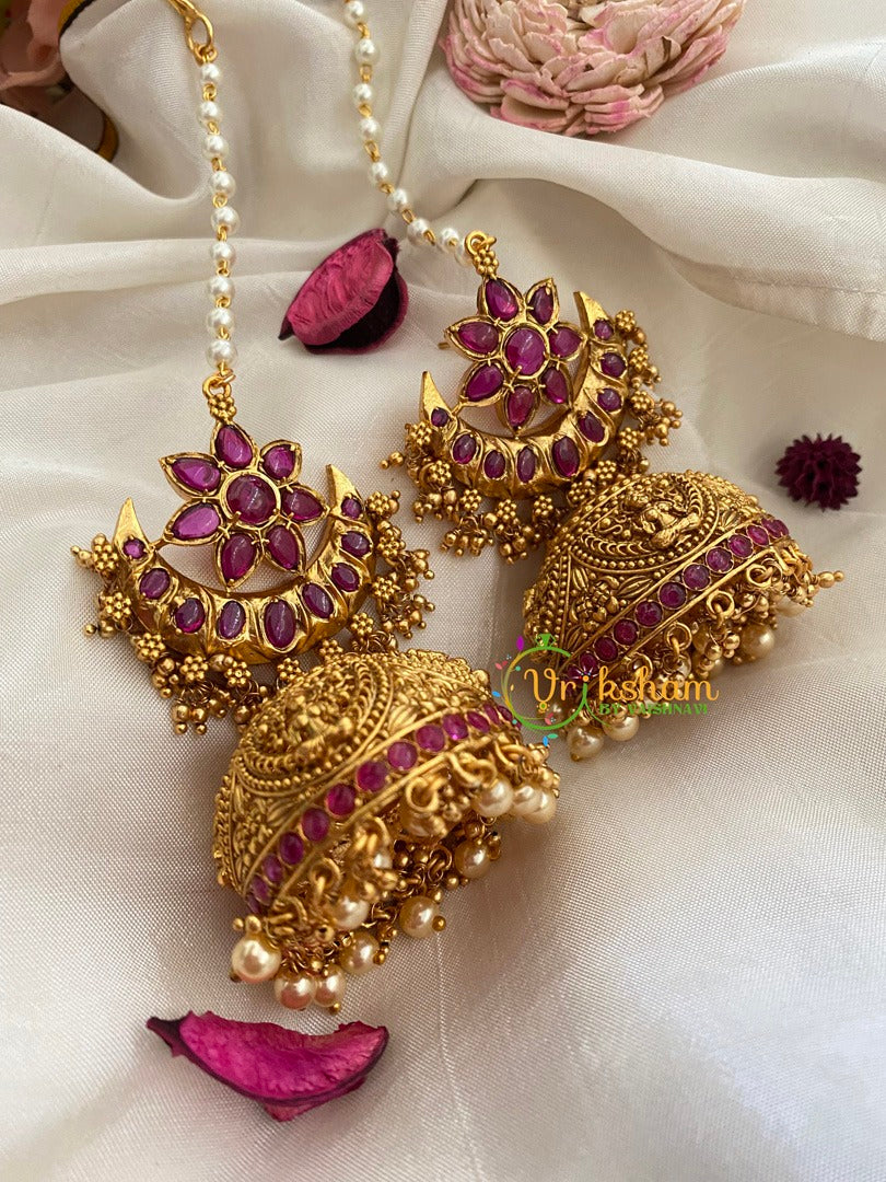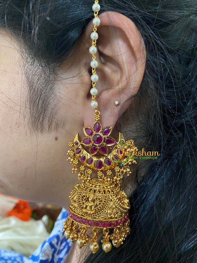 Traditional Floral Jhumkas with Maatil- Red ad stone studded in flower on half moon; comes with single strand pearl maatil.