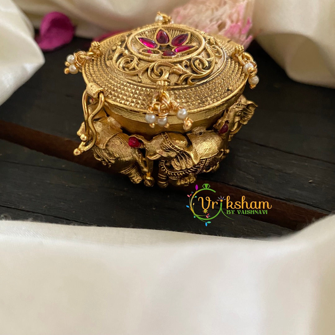 Floral Kemp Kumkum Box with Elephants in a round shaped red kemp stone studded box with a flower on top walking elephants on side and hanging pearls.