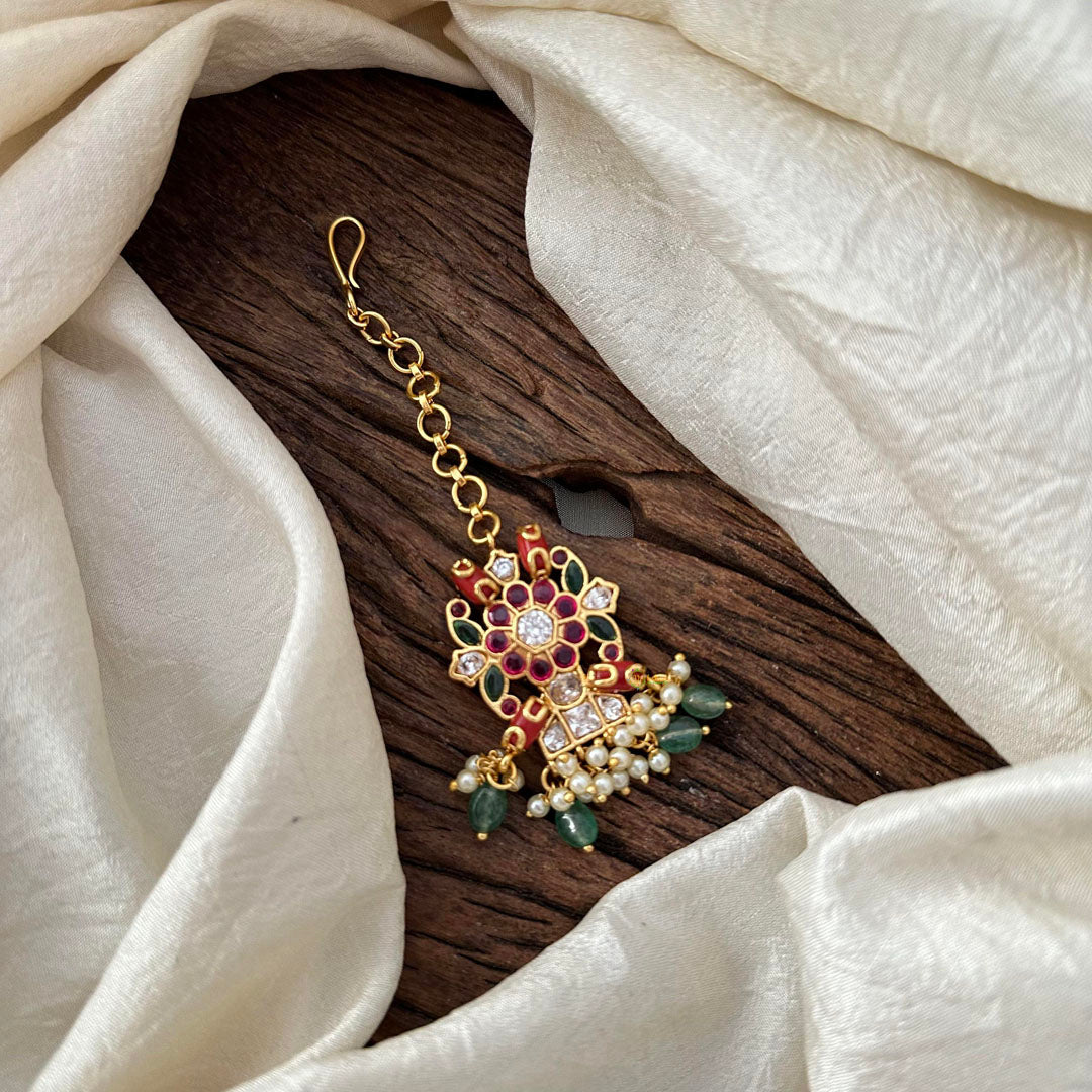 Adorn yourself with our exquisite Floral Maang Tikka, adorned with charming coral and delicate aqua green beads and pearls. This luxurious accessory is perfect for adding a touch of elegance and sophistication to any outfit. The intricate floral design and high-quality materials make it a must-have for any fashion forward individual.