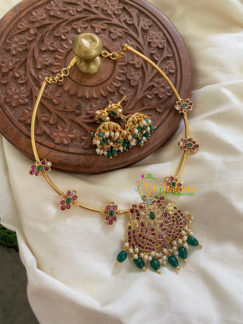 AD Stone Floral Pendant Hasli-Green bead finish- flowers on sides ;premium quality AD Stone studded pendant hasli short neckpiece, comes with matching earrings.