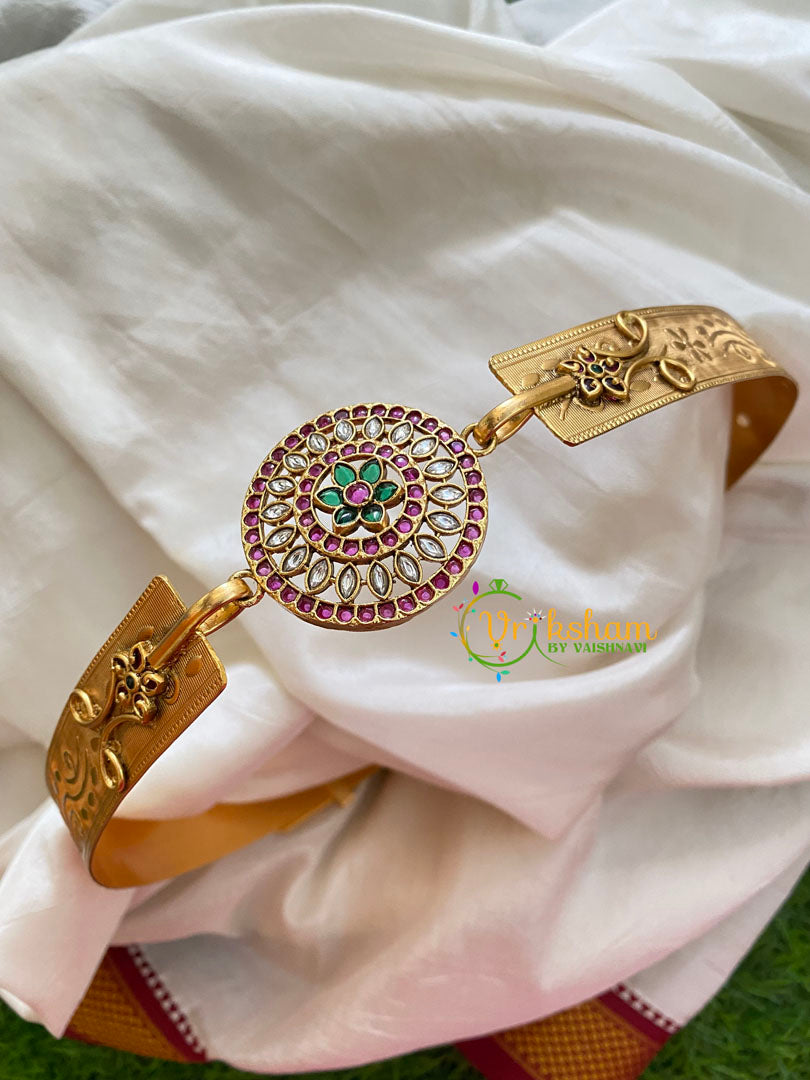Premium AD Stone Floral Pendant Plain Hipbelt -Flower and Fern embossed on plain hipbelt -Elegant centre pendant with ad stone Flower design and tiny flower on either sides.