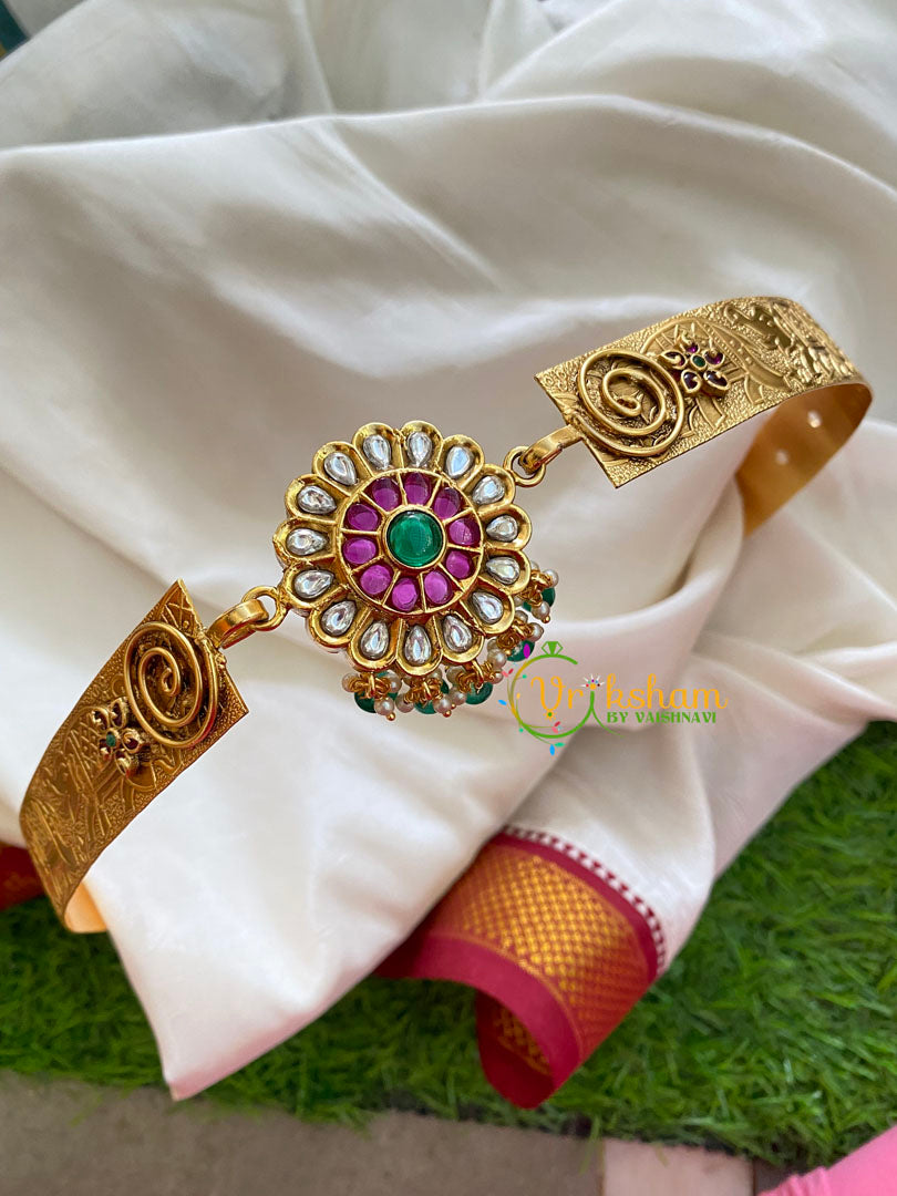 AD Stone Floral Pendant Plain Hipbelt– Gold Look alike Hipbelt with green and red imitation stone and elephant embossed plain hipbelt.