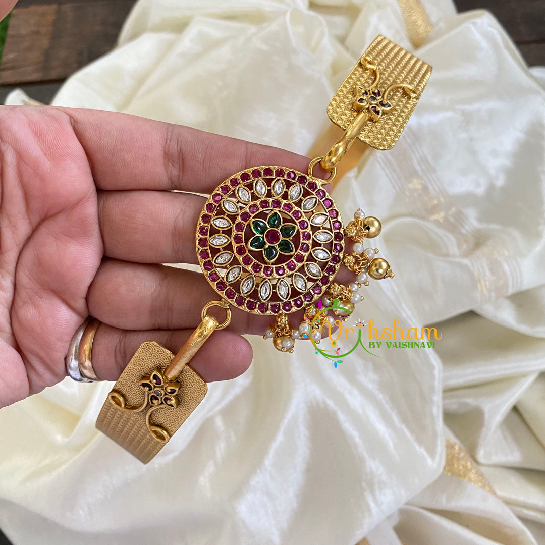 AD Stone Floral Pendant Plain Hipbelt -Ghungroo- Gold Look alike Hipbelt with green and red imitation stone and embossed plain hipbelt.