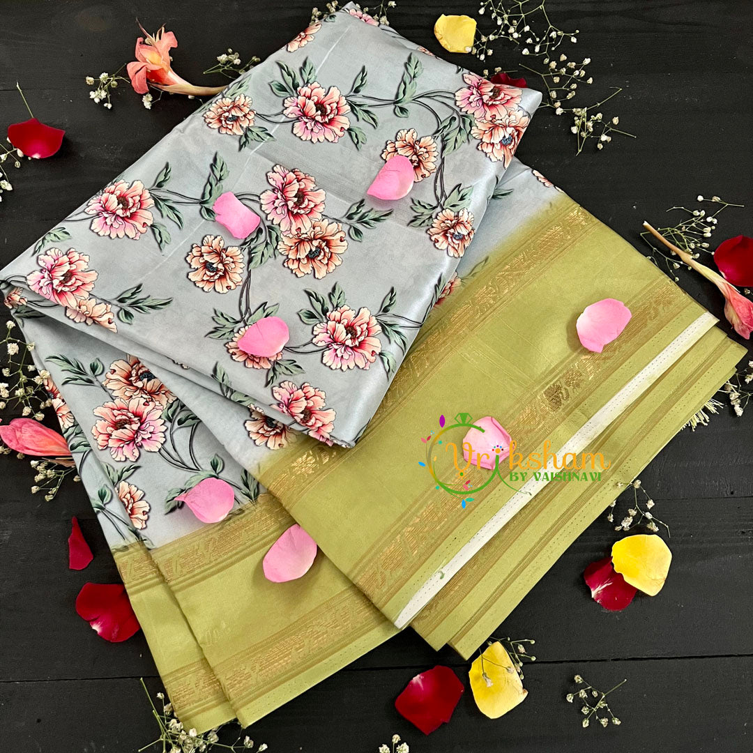 Grey with Green Floral Semi Soft Silk Saree - with traditional border - Pattern throughout the saree; comes with Blouse attached. Two side contrast border and pallu.