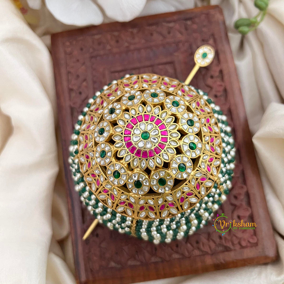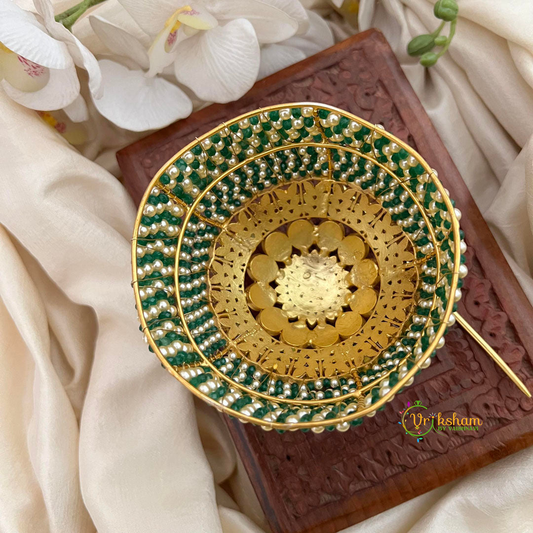 Elevate your traditional look with this exquisite Floral Emerald Green and Pearl Moti Juda Pin. Inspired by South Indian heritage, this bun cage features a stunning emerald green base adorned with lustrous pearl accents and delicate floral detailing. Perfect for weddings, festivals, and cultural celebrations, it brings timeless elegance and authentic charm to your classical attire. The intricate craftsmanship honors traditional aesthetics while adding sophisticated grace to your ensemble.