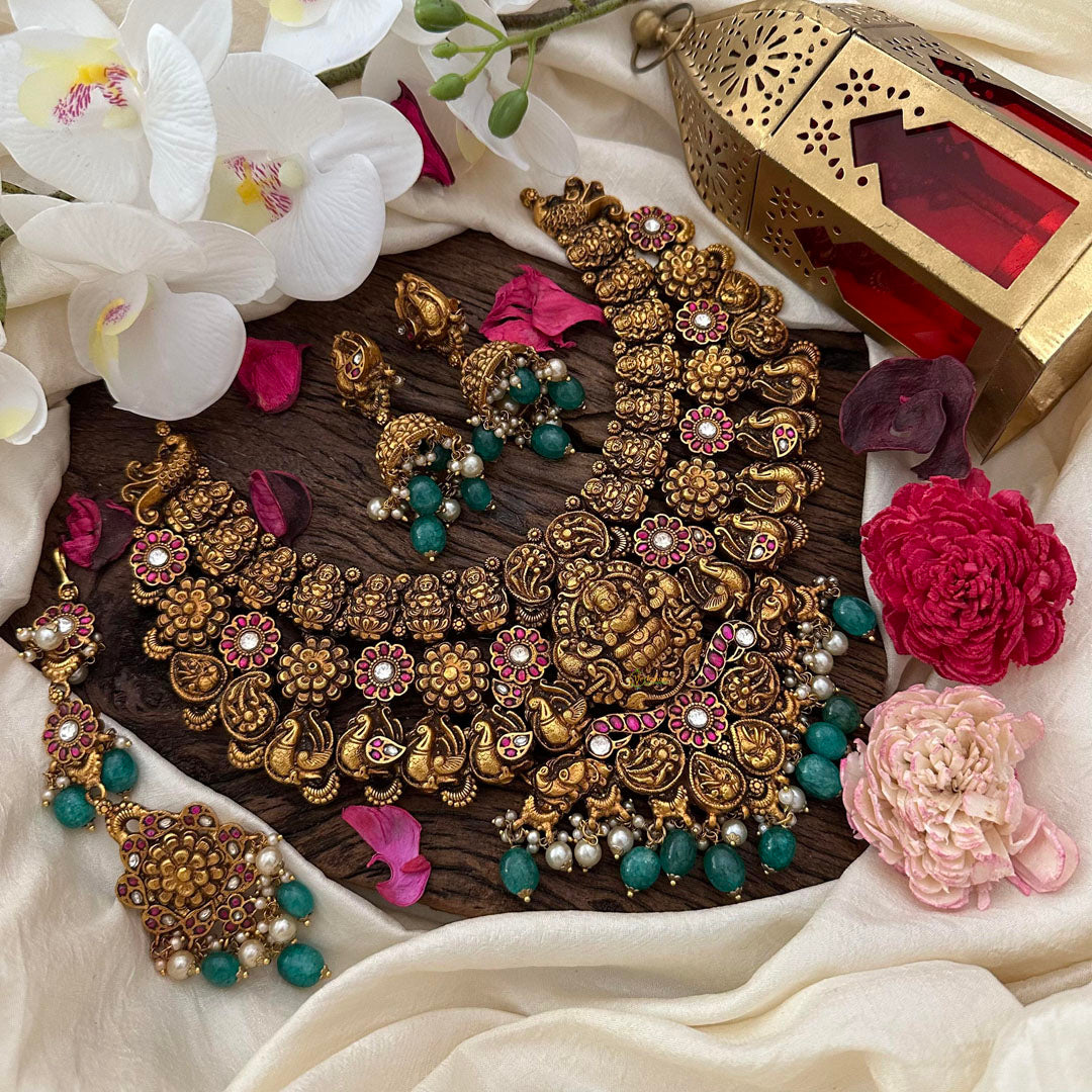 Add a touch of elegance to your ensemble with our Antique Polish Jadau Kundan Lakshmi Neckpiece. Adorned with beautiful green beads and pearls, this piece exudes luxury and sophistication. Complete your look with the matching tikka and jhumkas for a truly exclusive and timeless style.