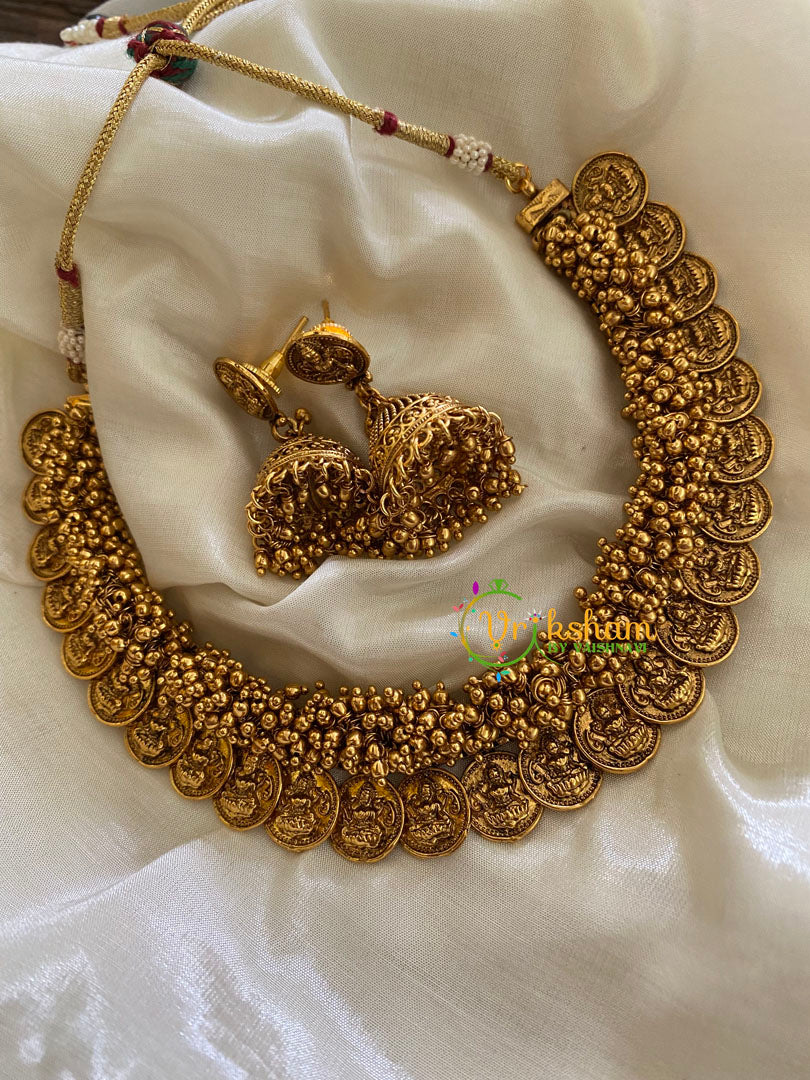 Premium Cluster Ghungroo Lakshmi Coin Choker- Temple Choker with Lakshmi and heavy cluster ghungroo on top layer; comes with matching ear hangings.
