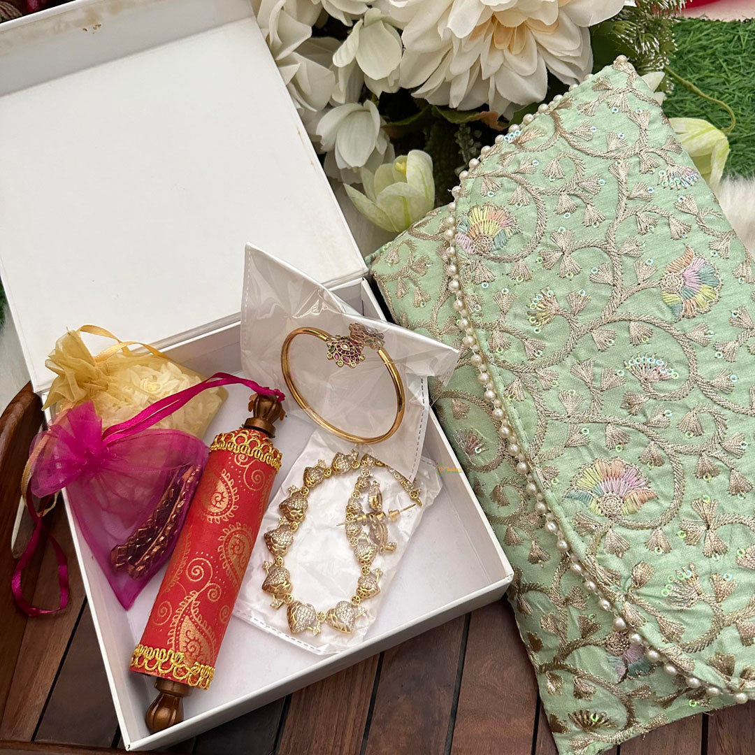 Surprise your loved ones with the Rakhi Hamper 2 ! This stylish sling bag is perfect for both casual and traditional outfits. The heart-shaped American diamond neckpiece and matching earrings add a touch of glamour, while the scented jasmine flower accessory and kundan hair clip add elegance. The gold look-alike kundan stone bracelet with lotus designs elevates this hamper even more. Personalize it with a customized message written on a roll for your loved ones.( Kindly let us know the message you want to be written on it.)