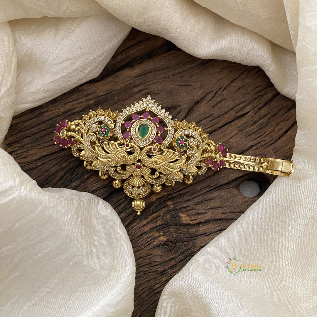 Gold Alike AD Stone Dual Peacock Hairclip - Gold Look Alike hair clip for festive braids and hairstyling, with gold bead finish.