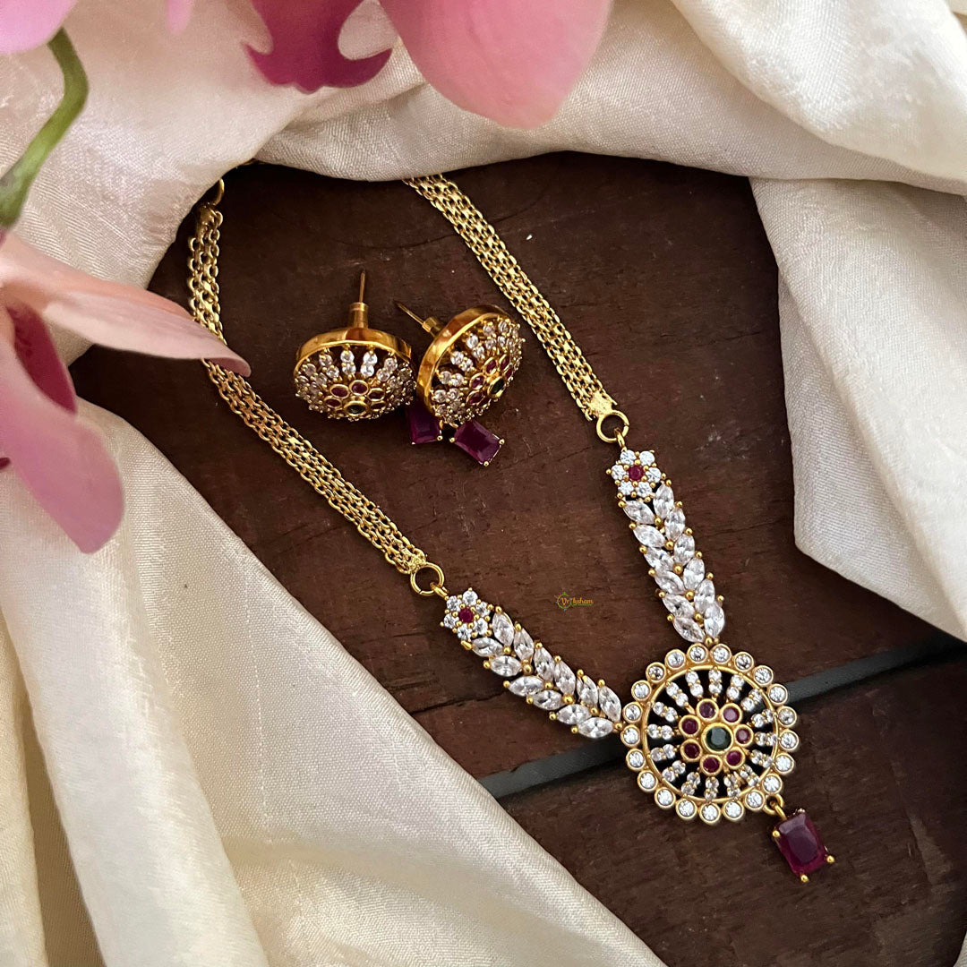 Make a statement with our breathtaking Gold Alike Ad Stone Floral Pendant Short Neckpiece in Red Green ! This stunning necklace is adorned with a beautiful floral pendant and comes with matching earrings. Perfect for adding a touch of elegance and sophistication to any outfit. Stand out and shine with this unique piece!