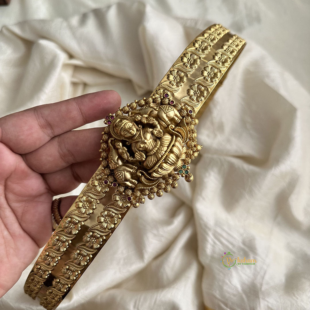 Gold Alike Dual Haathi Lakshmi Pendant Plain Hipbelt - Gold Bead -Featuring a delicate Lakshmi pendant embellished with intricate detailing, the addition of dual elephant motifs adds a touch of regal splendor, symbolizing grace and beauty in traditional Indian culture.