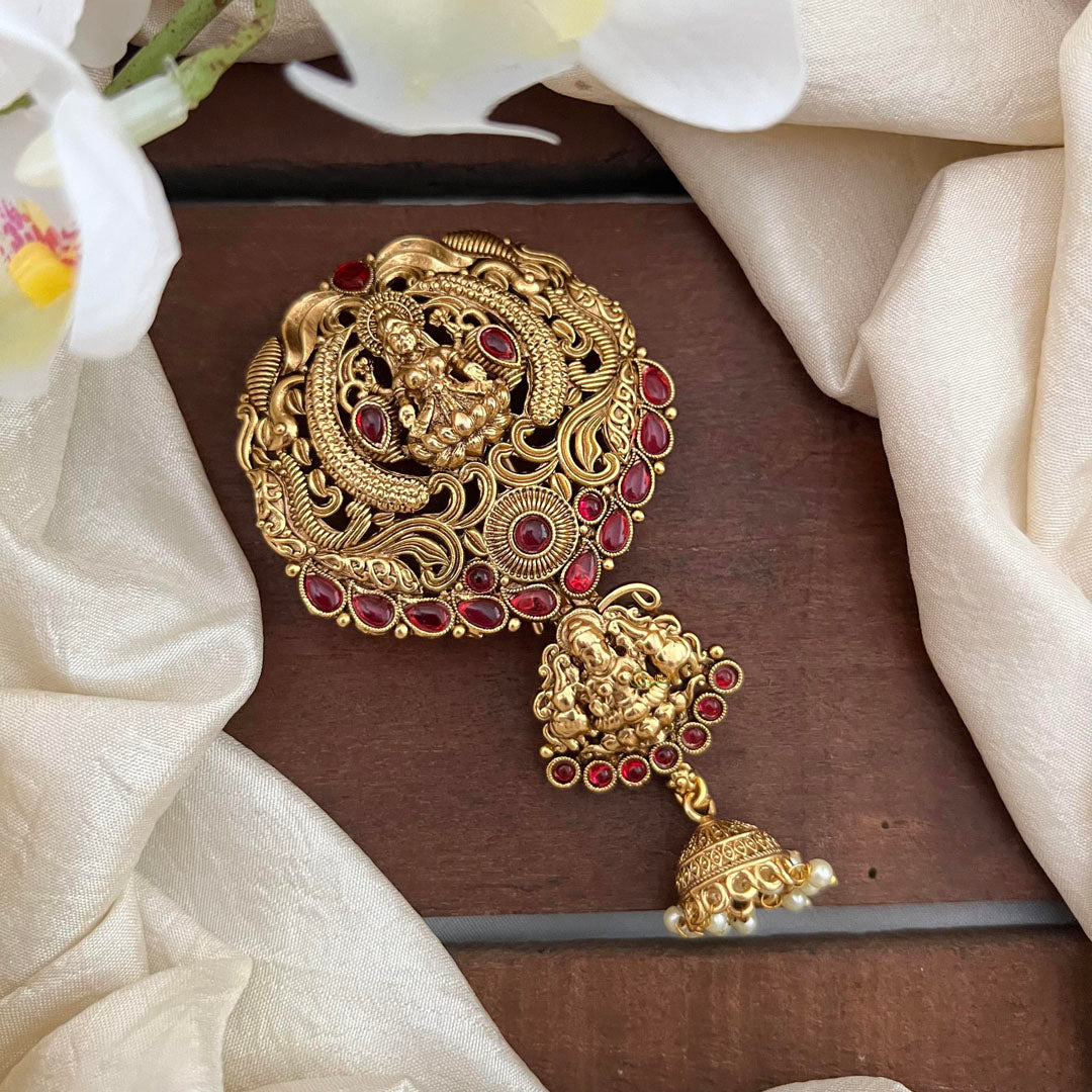 Elevate your traditional jewelry game with our Gold Alike Lakshmi Bun Billai-Jhumka Jada Billai in stunning red. Embody the goddess of wealth and fortune with this ornate design. Bring a touch of elegance to any outfit with the perfect balance of gold and color.