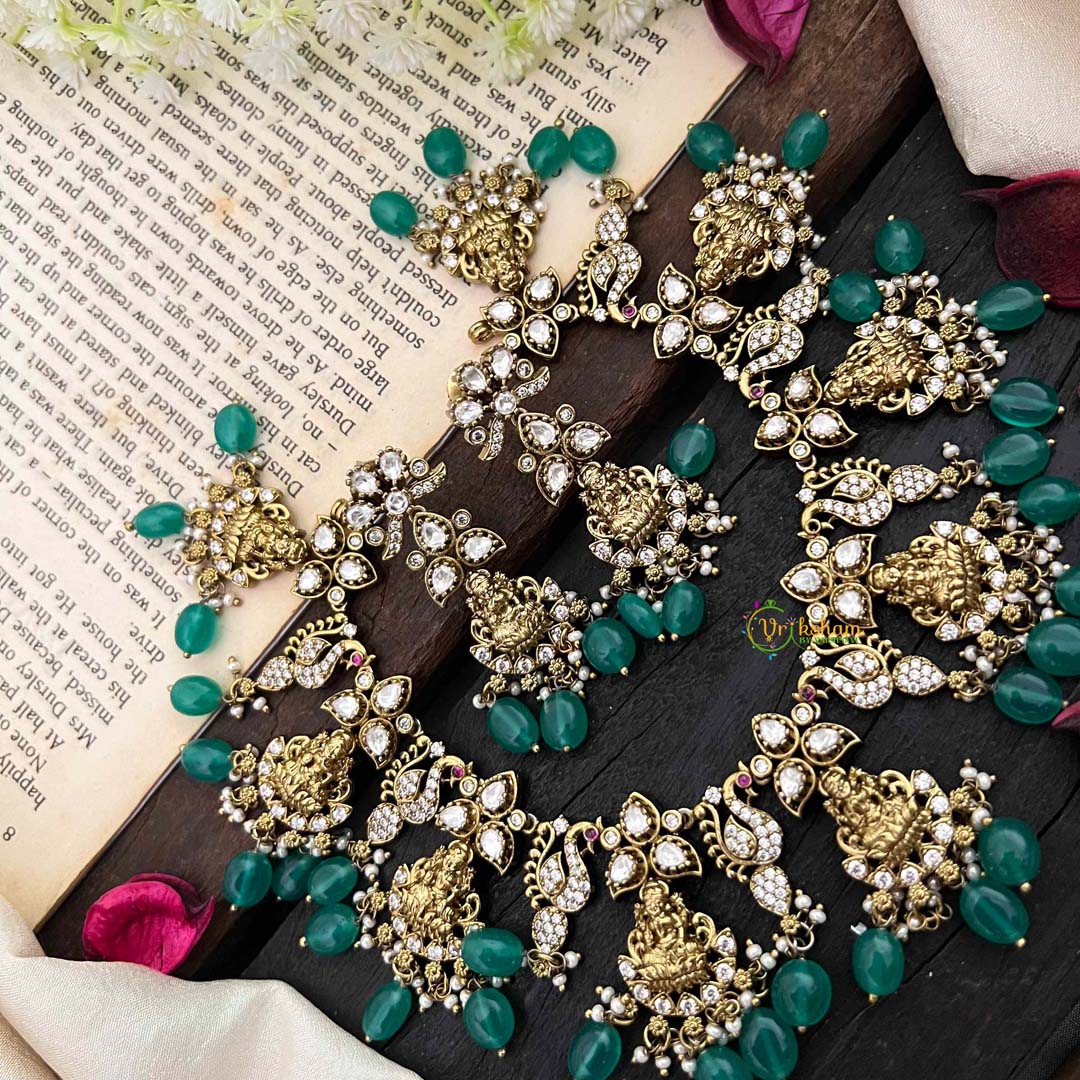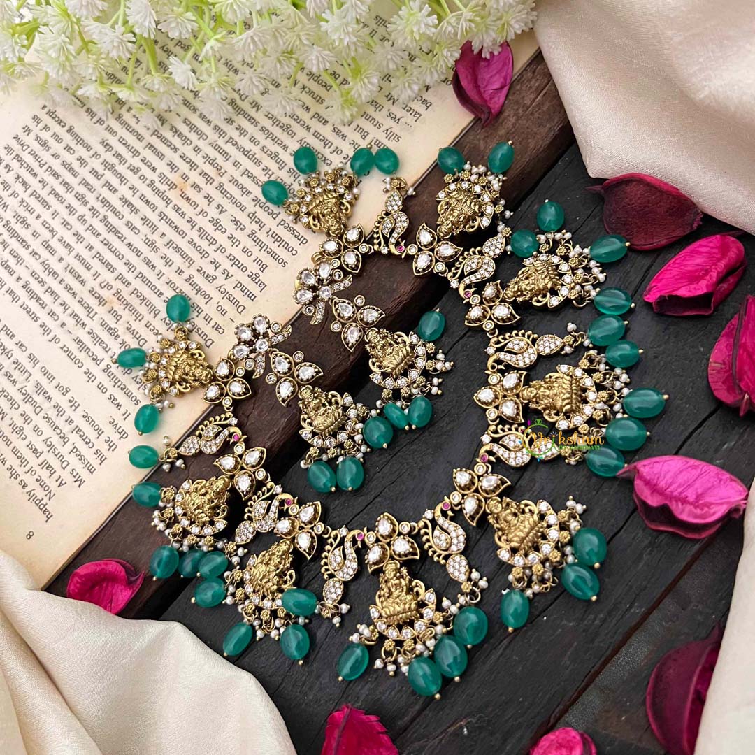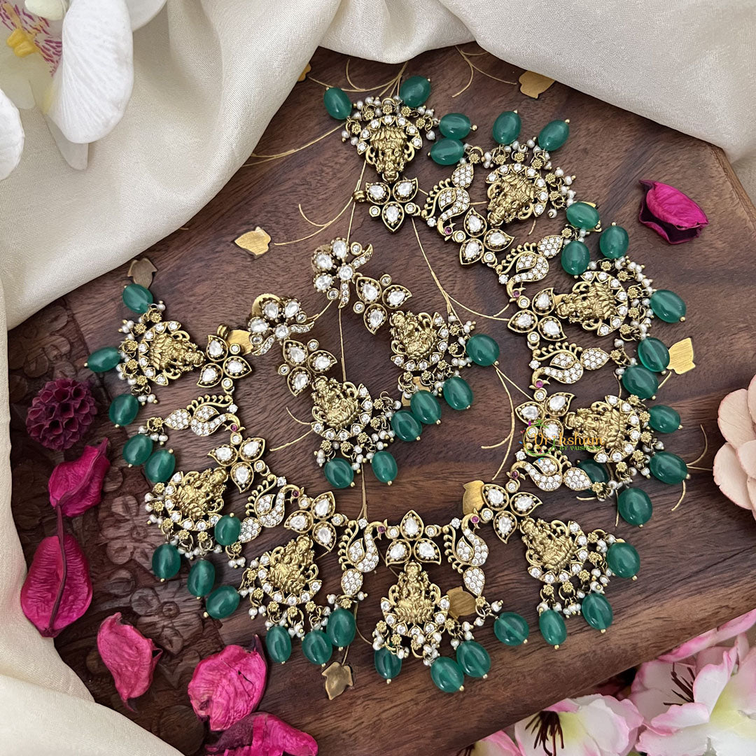 Enhance your neckline with our elegant Gold Alike Lakshmi Victorian Diamond Short Neckpiece. The stunning white diamonds and green beads create a timeless look, perfect for any occasion. Add a touch of sophistication to your outfit and make a statement with this beautiful accessory. Comes with matching earrings.