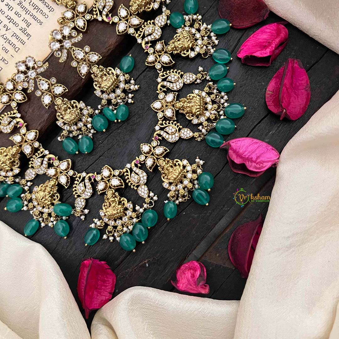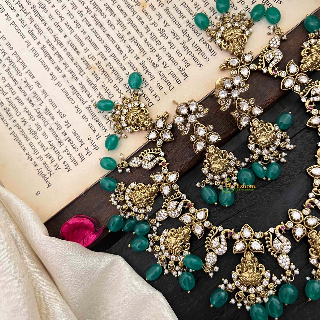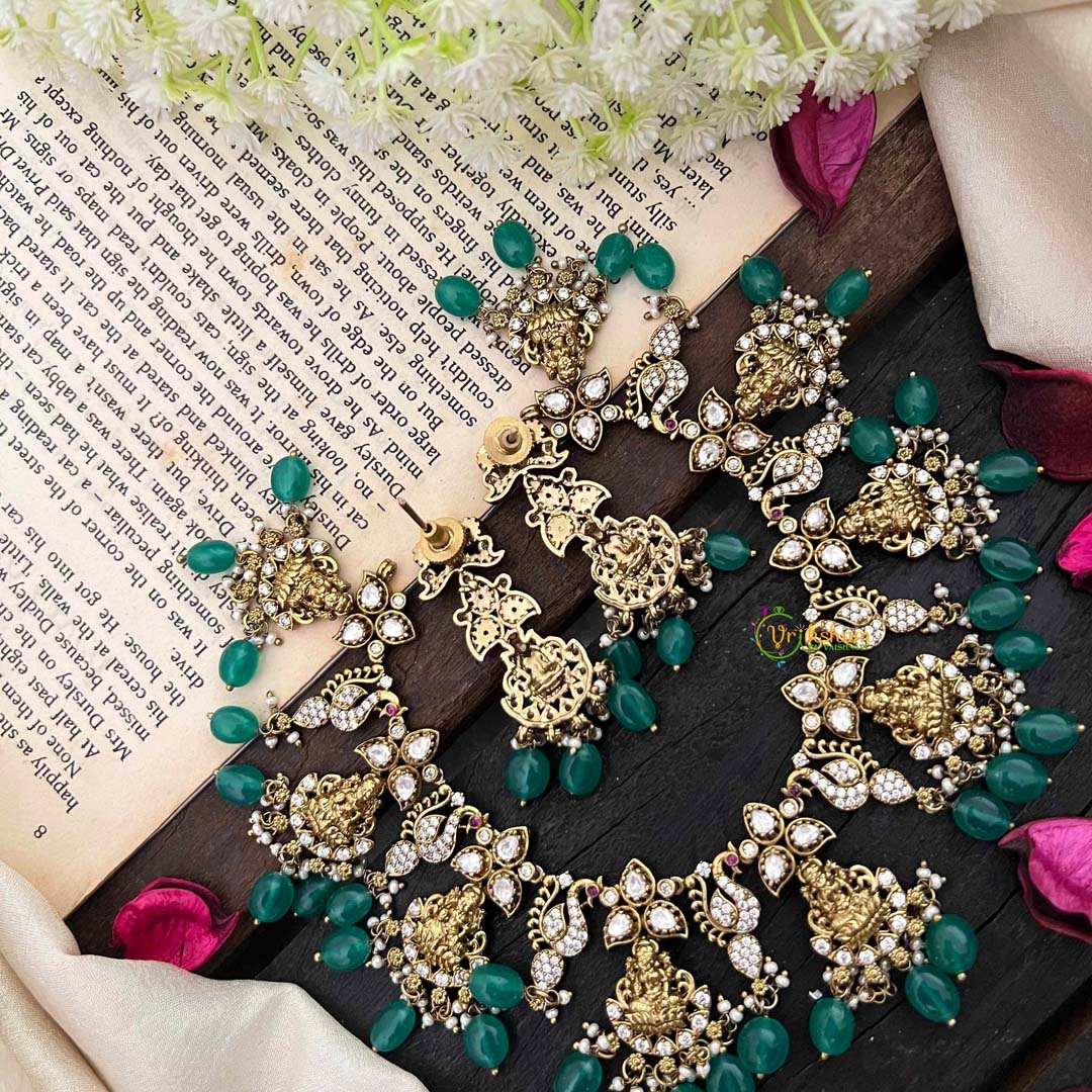 Enhance your neckline with our elegant Gold Alike Lakshmi Victorian Diamond Short Neckpiece. The stunning white diamonds and green beads create a timeless look, perfect for any occasion. Add a touch of sophistication to your outfit and make a statement with this beautiful accessory. Comes with matching earrings.