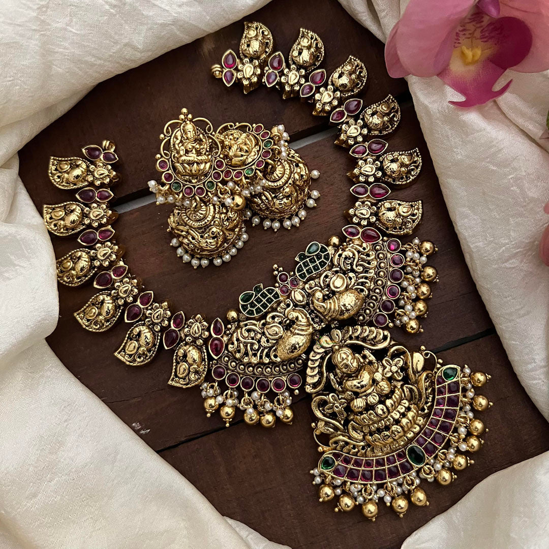 Unleash your inner goddess with the Gold Alike Mayil Lakshmi Short Necklace. This stunning piece features intricate golden beads and lustrous pearls, exuding elegance and grace. Perfect for any occasion, this necklace is sure to turn heads and make you feel confident and beautiful. Comes with matching earrings.
