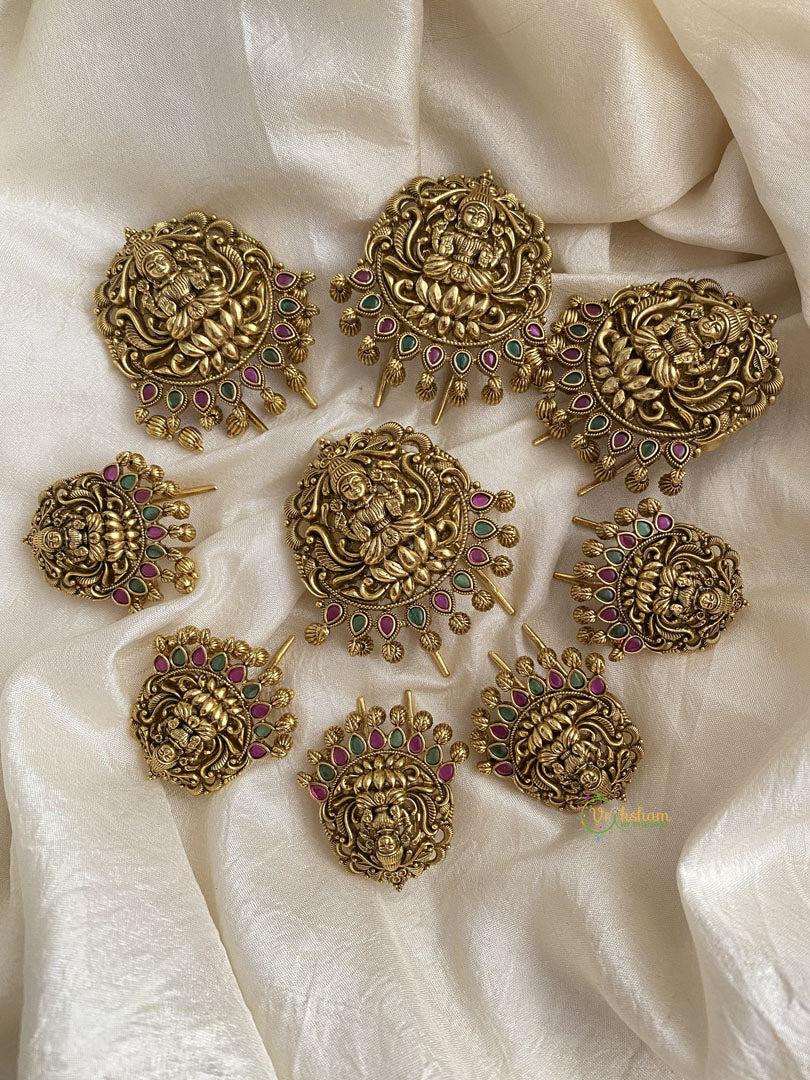 Gold Alike Traditional Lakshmi Jada Billai with Ghungroo - 9 pieces of temple billai - Gold look alike Lakshmi Jada Billai is a symbol of auspiciousness and blessings, the presence of Goddess Lakshmi on this Jada Billai infuses it with deep spiritual meaning, making it not just a decorative piece, but also a conduit for positive energy and well-being. Whether worn for weddings, festivals, or other special occasions, the Gold Look Alike Lakshmi Jada Billai with Pearl is sure to elevate any look with its timeless beauty and cultural significance.