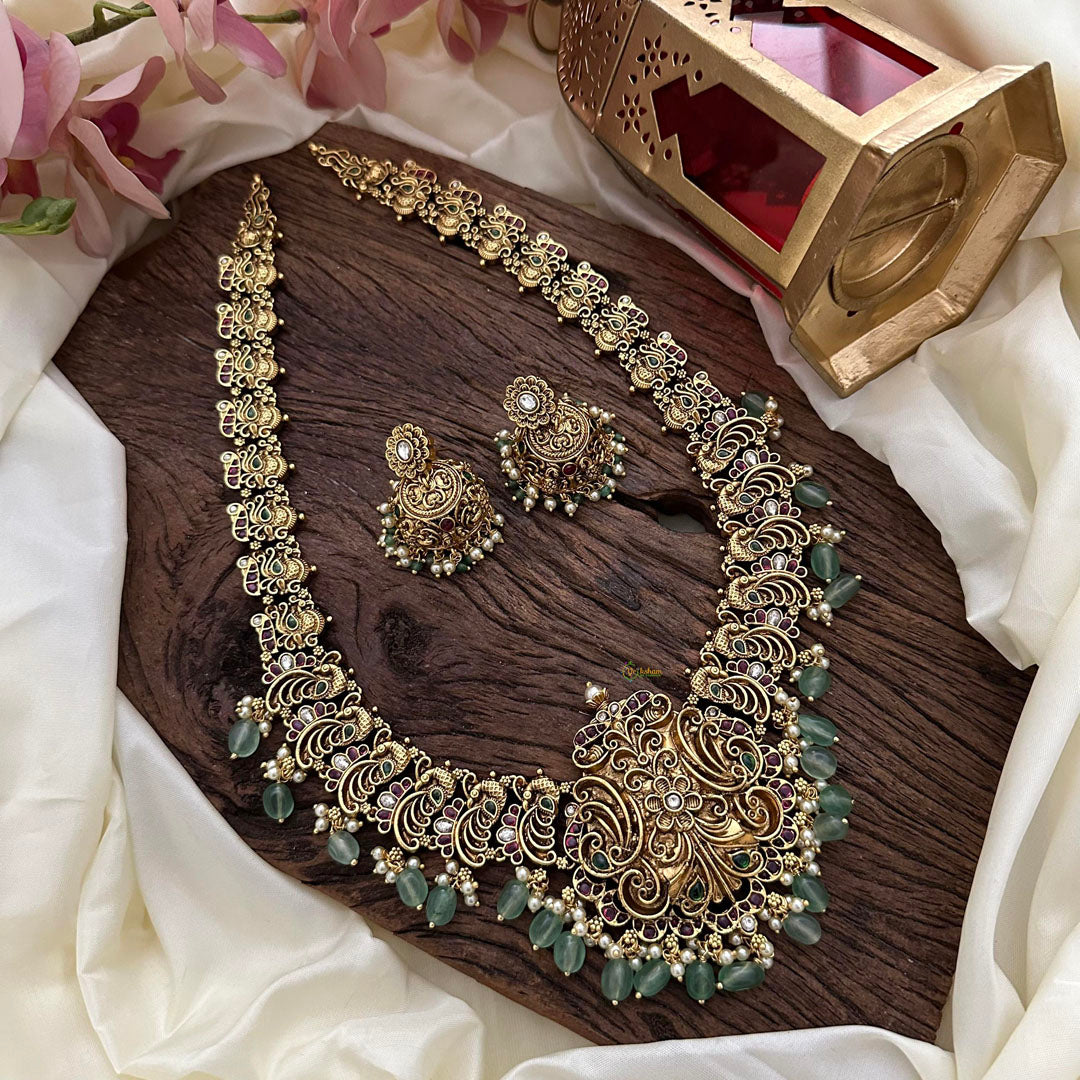 Indulge in luxury with our Gold Alike Peacock Long Neckpiece. Adorned with beautiful aqua green beads and pearls, this exquisite necklace features a peacock design that will make you feel elegant and exclusive. Perfect for any occasion, this necklace will be the statement piece of your outfit.