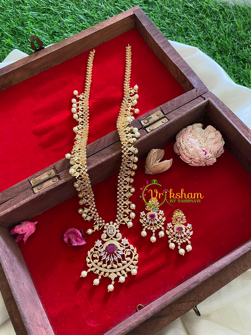 Gold American Diamond Bridal Haram-Pearl Red– gold look alike tone with centre Red stone idol work in gold imitation jewelry set-Pearl finish; Comes with a pair of similar earrings.