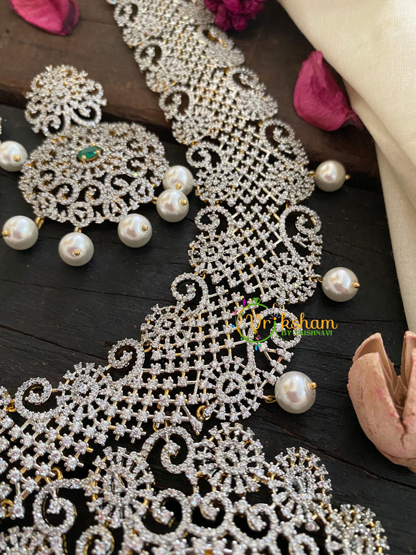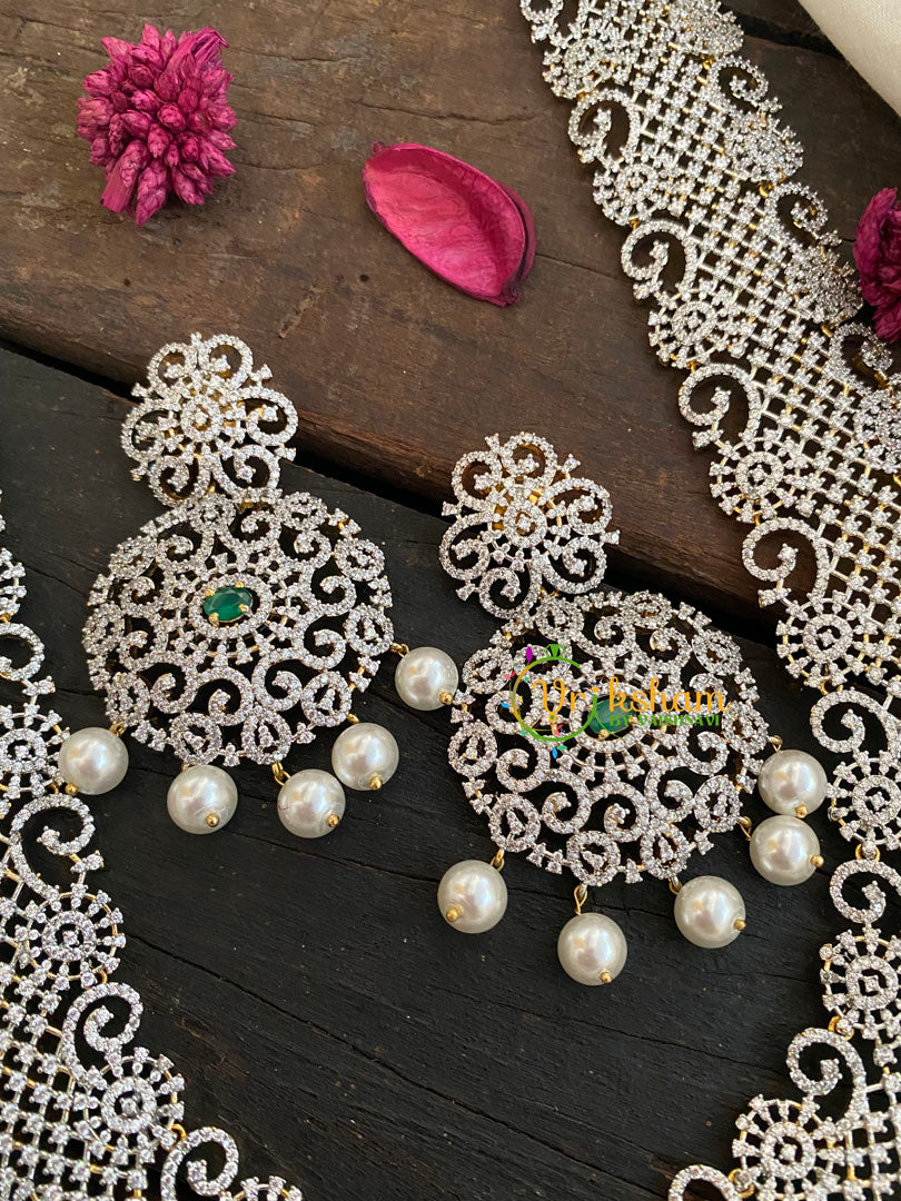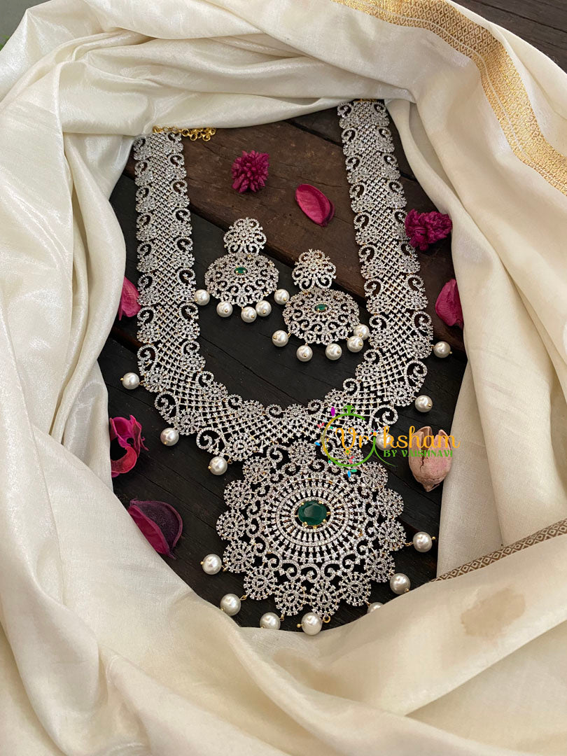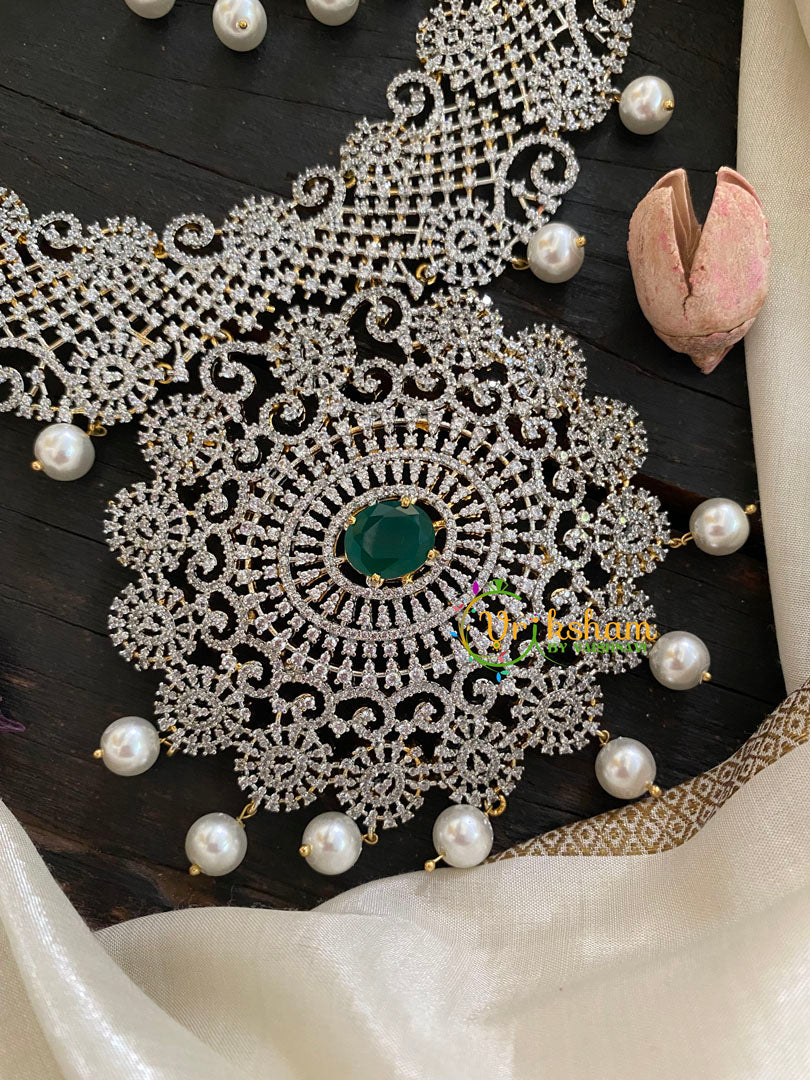 Gold American Diamond Bridal Haram- gold look alike tone with centre Green stone imitation jewelry set; Comes with a pair of similar earrings.