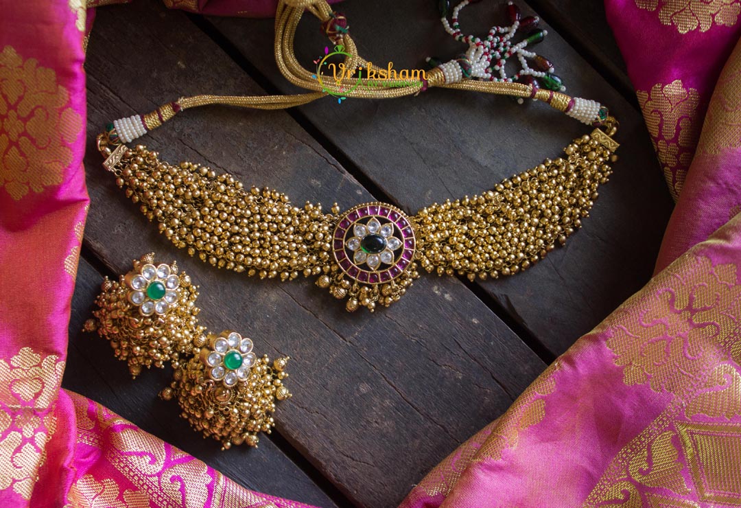 Golden balls high neck choker with a center pendant made of precious kemp and comes with a beautiful pair of large jhumkas