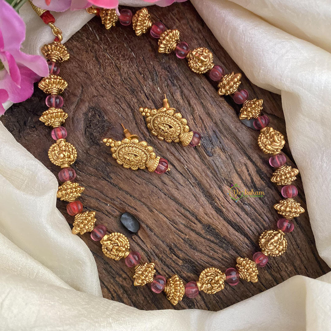 Indulge in luxury with our Gold Beaded with Maroon Bead Mala. Each bead is hand-crafted with intricate detail, creating a unique piece that exudes elegance and sophistication. Comes with matching earrings for a complete, opulent look. Elevate your style and make a statement with our premium mala.