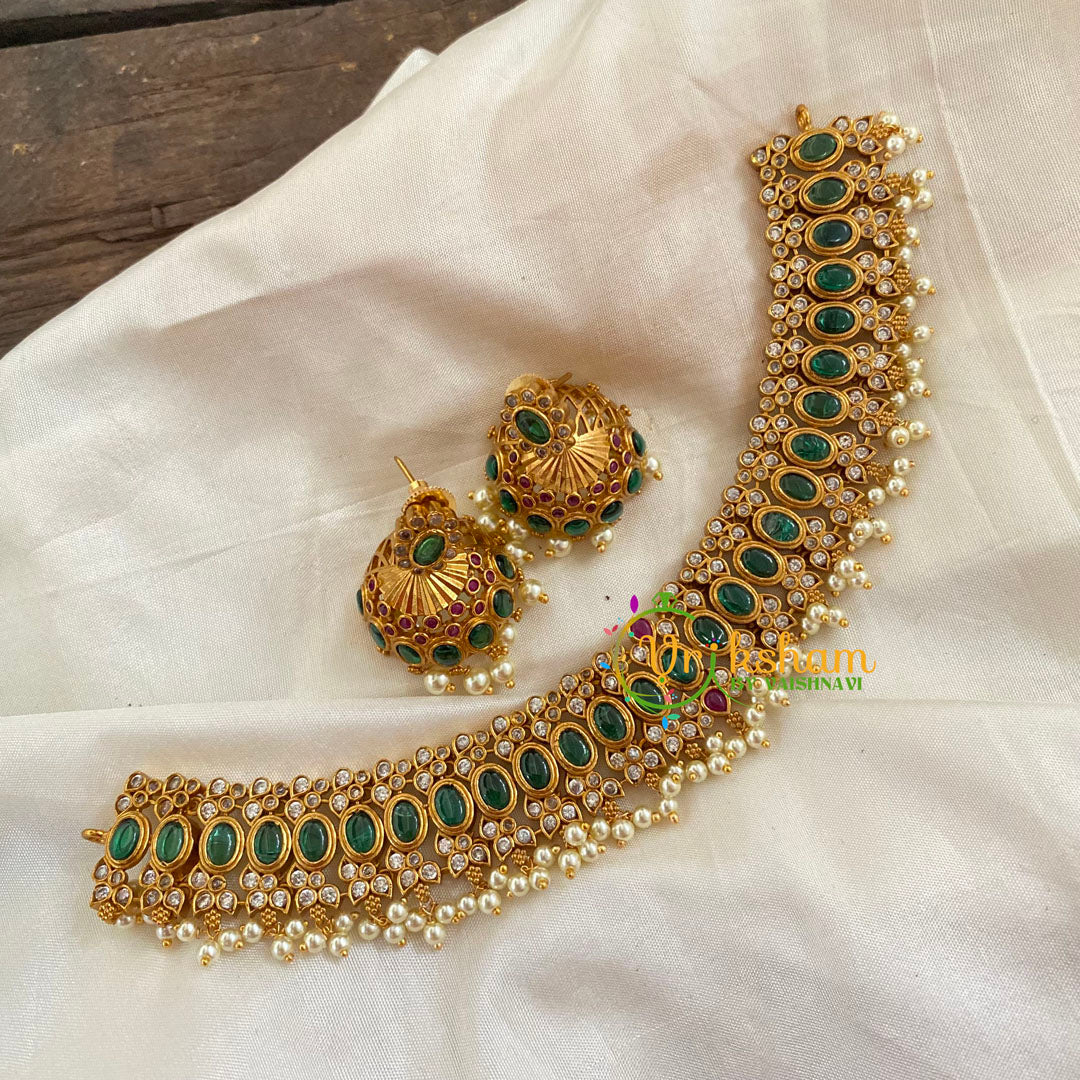 Premium Gold Choker Short Neckpiece - premium quality polish and green white imitation stones; comes with matching earrings.