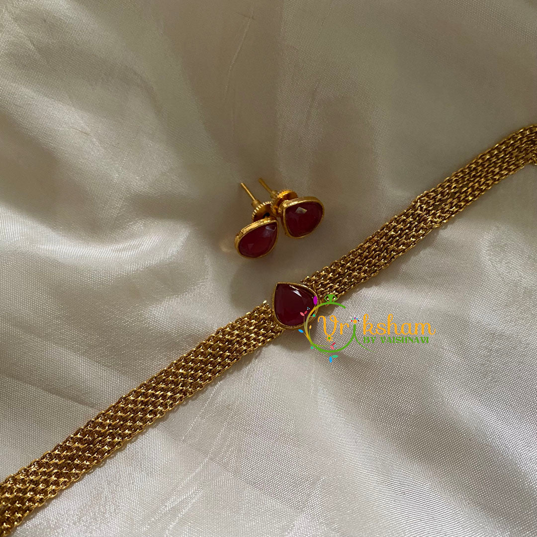 Gold Choker with Pendant -Red Tilak shaped centre red stone studded, 3 layered gold neckpiece. Comes with ear studs.