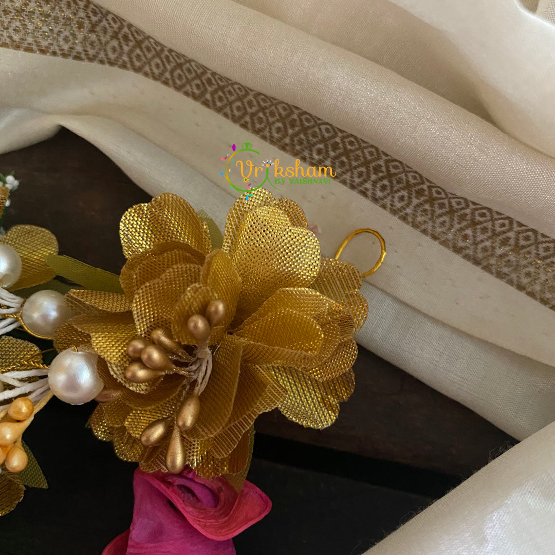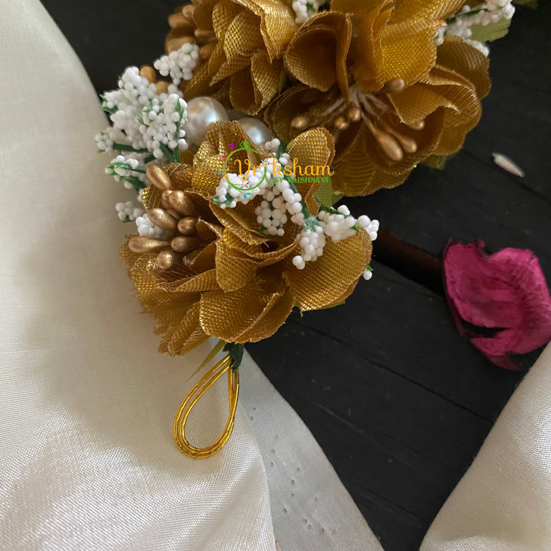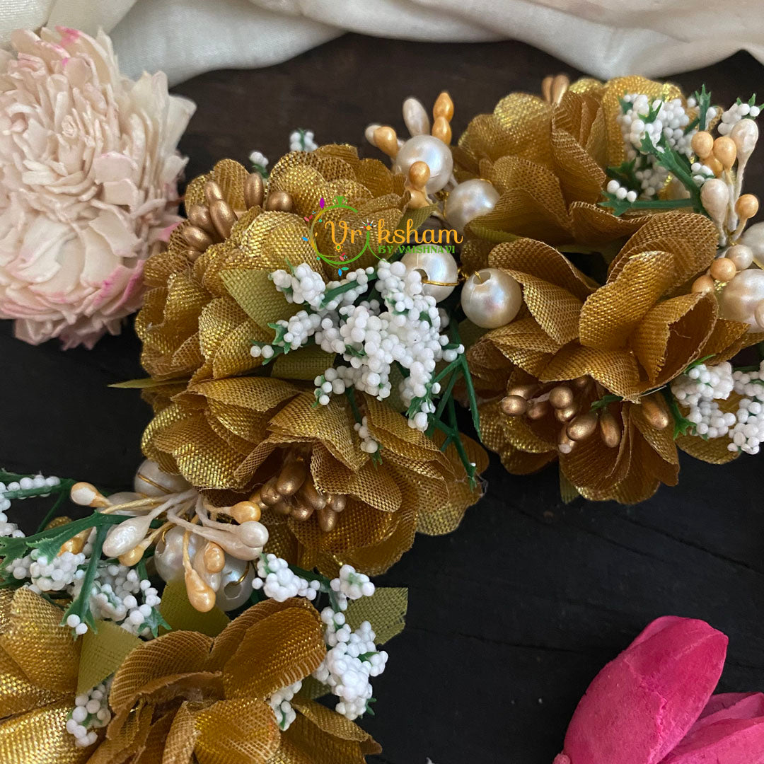 Gold Flower Veni Bridal Hair Accessory-Gold Veni with white and brown bud and pearls- Bridal Hair Accessory with bmetal string rope to tie around a bun.